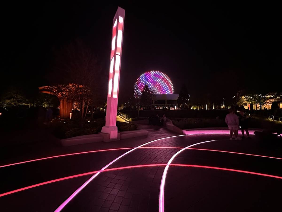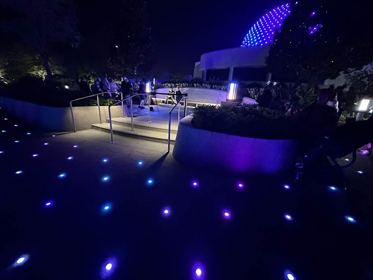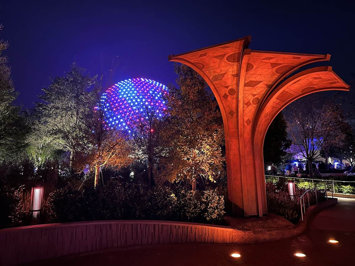Lights within the Gardens are synced with Spaceship Earth’s Beacons of Light, so when a musical performance occurs on the icon, the same lighting appears all around you. This synced lighting even goes as far as Connections and the breezeway to World Discovery.