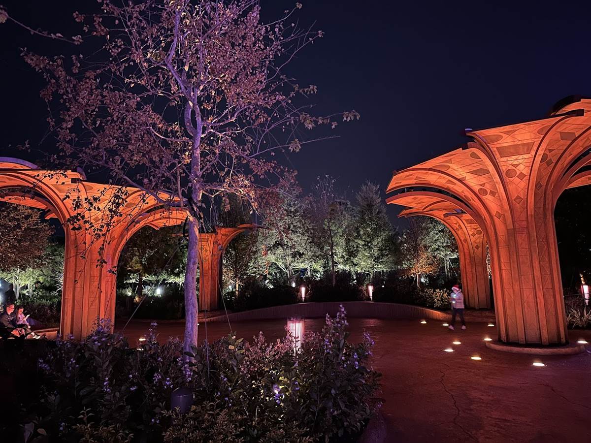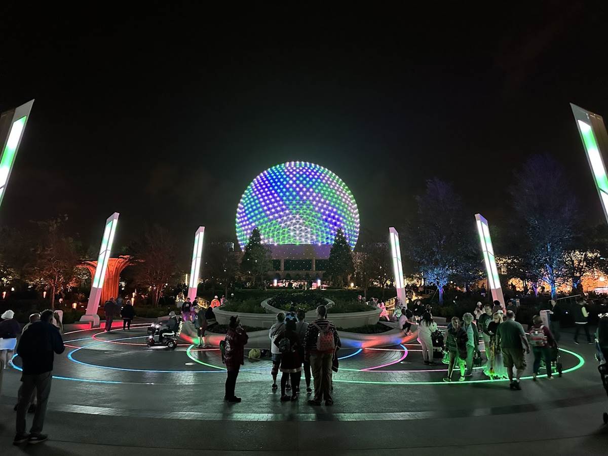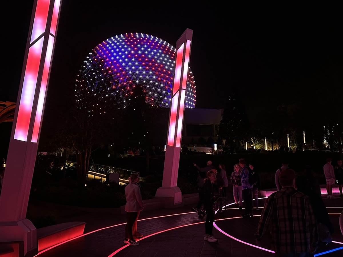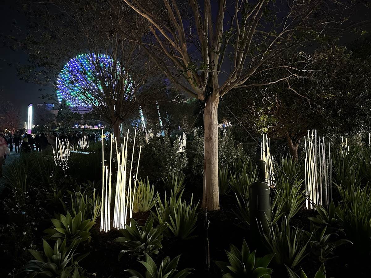 Lights within the Gardens are synced with Spaceship Earth’s Beacons of Light, so when a musical performance occurs on the icon, the same lighting appears all around you. This synced lighting even goes as far as Connections and the breezeway to World Discovery.