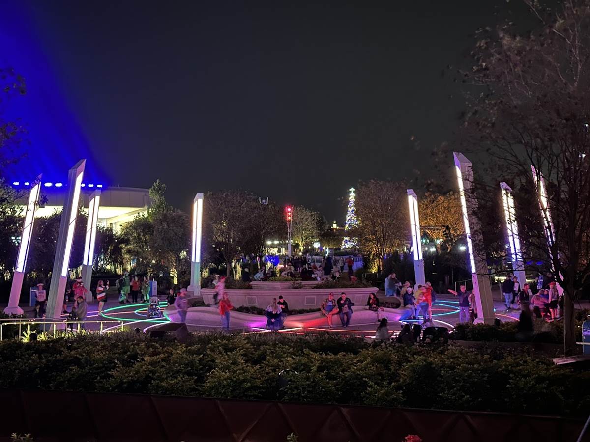 World Celebration, World Nature, and World Discovery can be viewed from the Celebration Gardens. The light towers in the very center are even color coordinated to the lands at certain points throughout the evening.