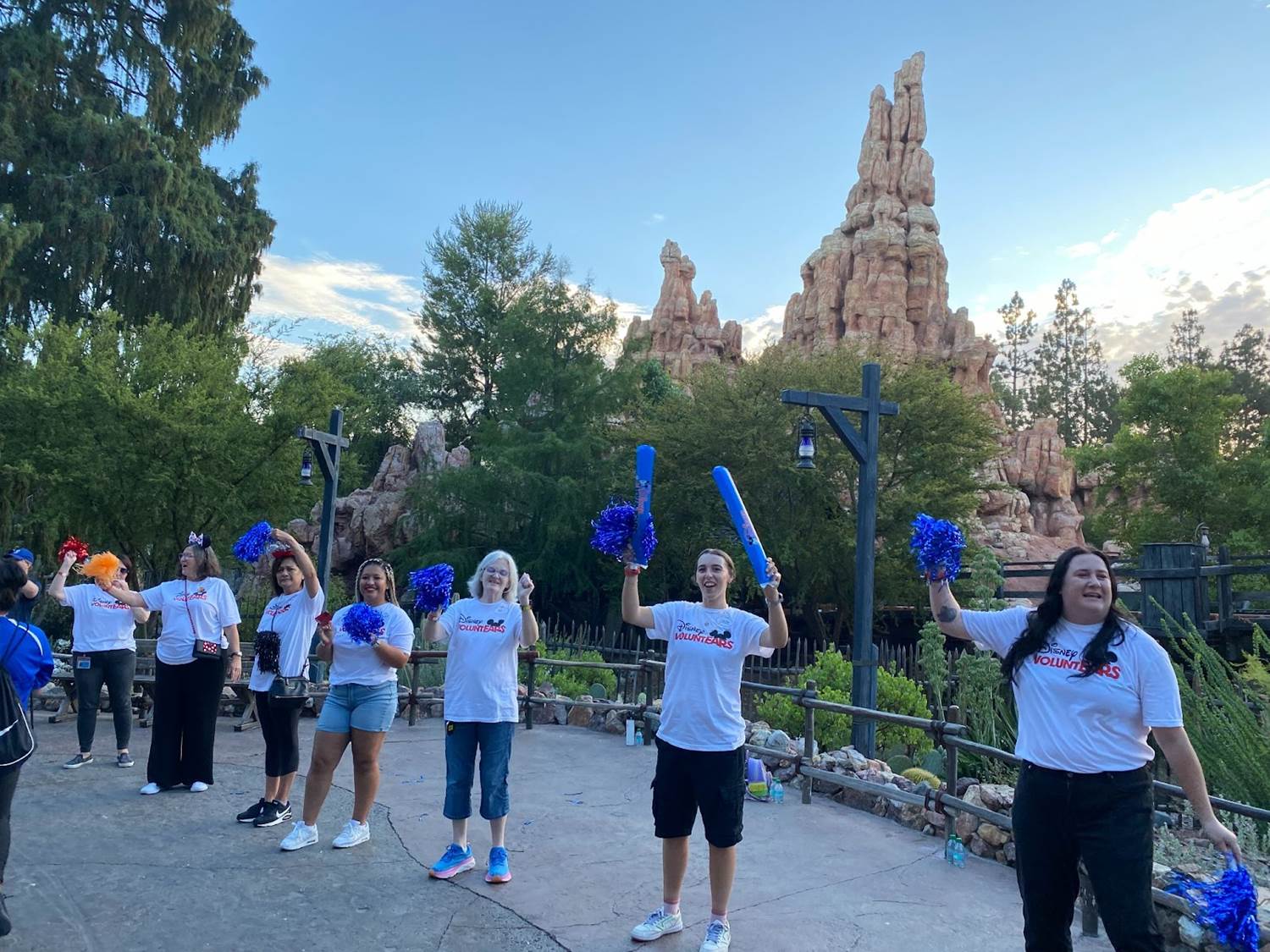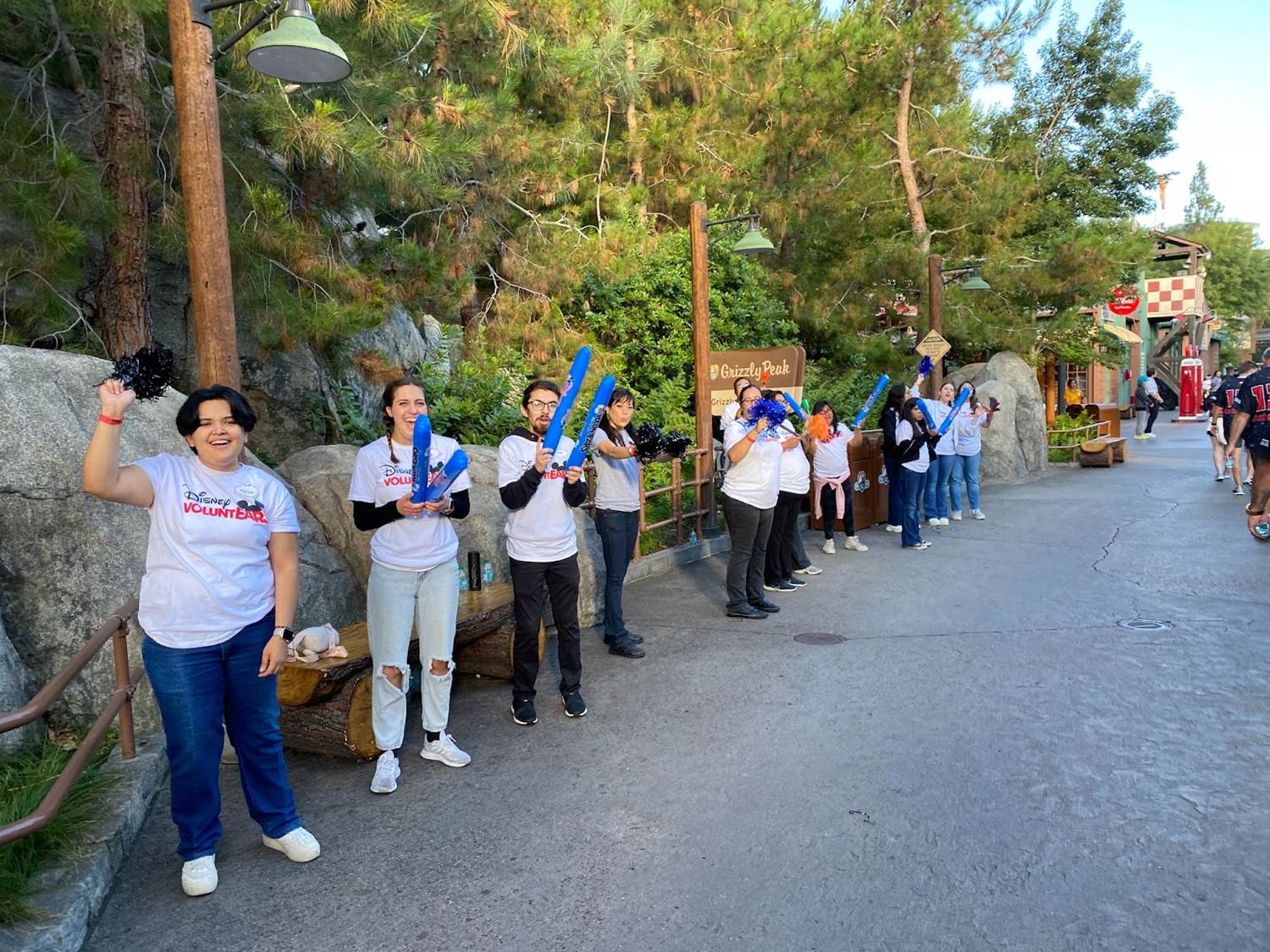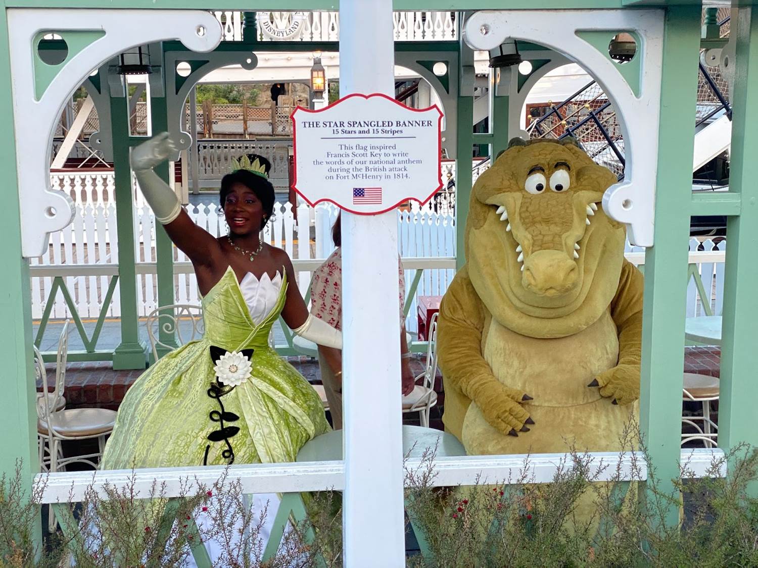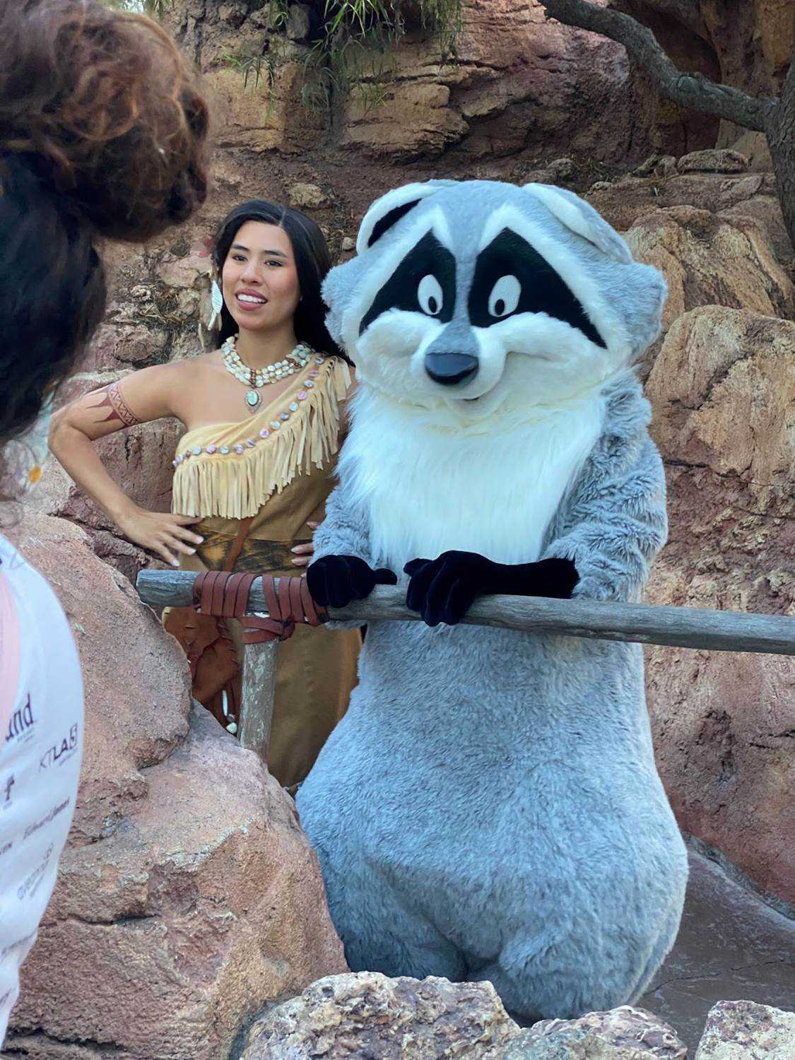 In Frontierland, we encountered Princess Tiana with Louis the alligator, along with Pocahontas and her pal Meeko. Disney Cast Member Volunt-Ears cheered us on as we passed Big Thunder Mountain Railroad.