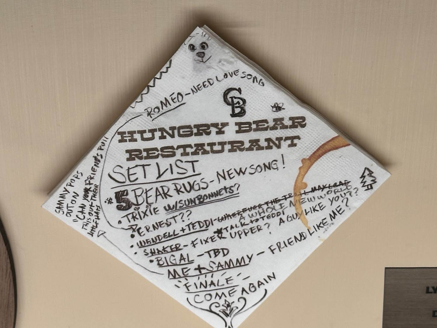 Eagle-eyed visitors might spot the set list to the show before they see it, on this napkin from the Hungry Bear Restaurant.