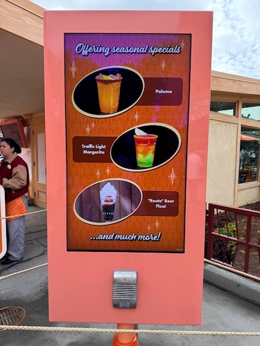 Guests can now easily place orders for all food and beverage selections at the Cozy Cone Motel from one centralized location. This simplified ordering system removes the necessity for guests to wait in line at each Cozy Cone kiosk to place their individual food and drink orders.