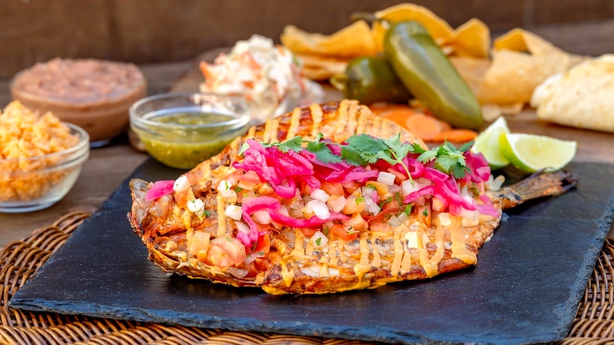 - Pescado Zarandeado: Whole grilled fish with corn tortillas, refried beans, Spanish rice, zesty slaw, pickled vegetables, and a side of chips and salsa (New)