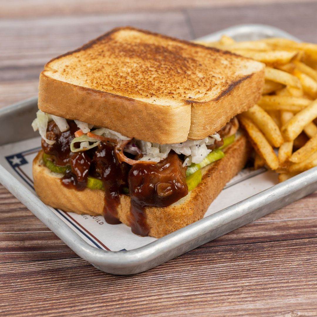 - BBQ Jackfruit Sandwich: Pulled BBQ jackfruit topped with coleslaw and pickles on garlic toast. Comes with a side.