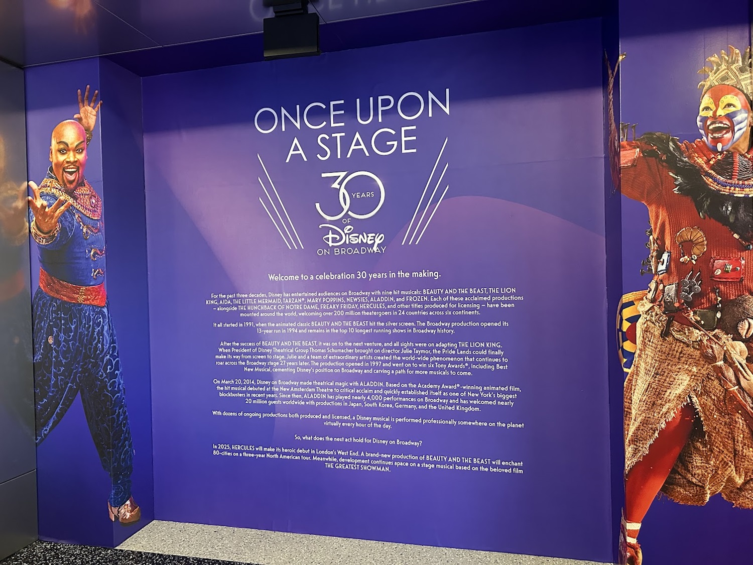 Once Upon A Stage - 30 Years of Disney on Broadway celebrates numerous productions, including The Lion King, Aladdin, Beauty and the Beast, Aida, The Little Mermaid, Tarzan, Newsies, and more. Guests visiting will see a plethora of props, puppets, costumes, and more from some of their favorite Disney musicals.