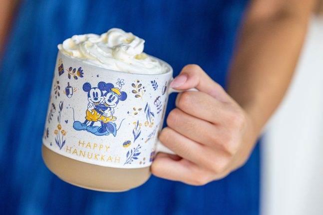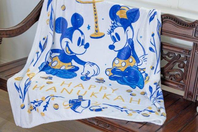 Mickey and Minnie share a special moment spinning the dreidel near the menorah in a design that inspires us to snuggle up and tell Hanukkah stories.