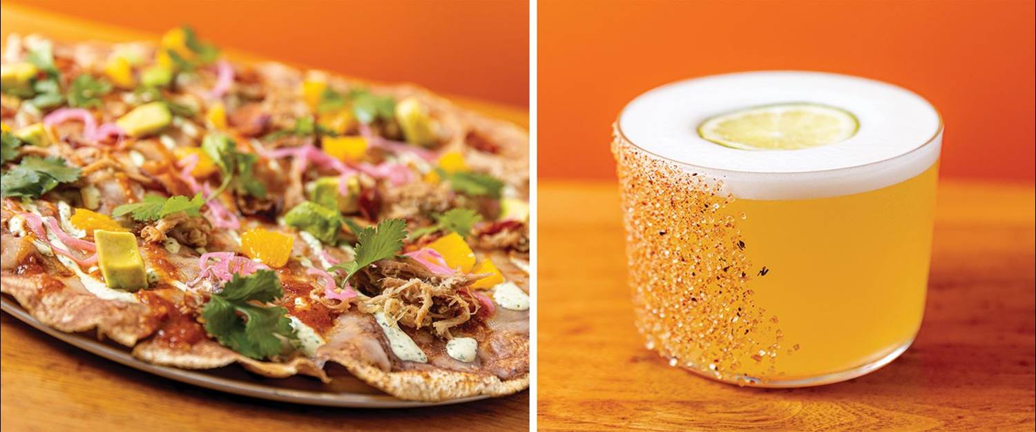 - Mojo-Citrus Gunthorp Carnitas Tlayuda: 14-inch gigantic corn masa tostada topped with black bean spread, chihuahua cheese, Nueske’s Applewood Smoked Bacon, Florida orange, avocado, pickled red onion, cilantro crema, and chipotle salsa (New)