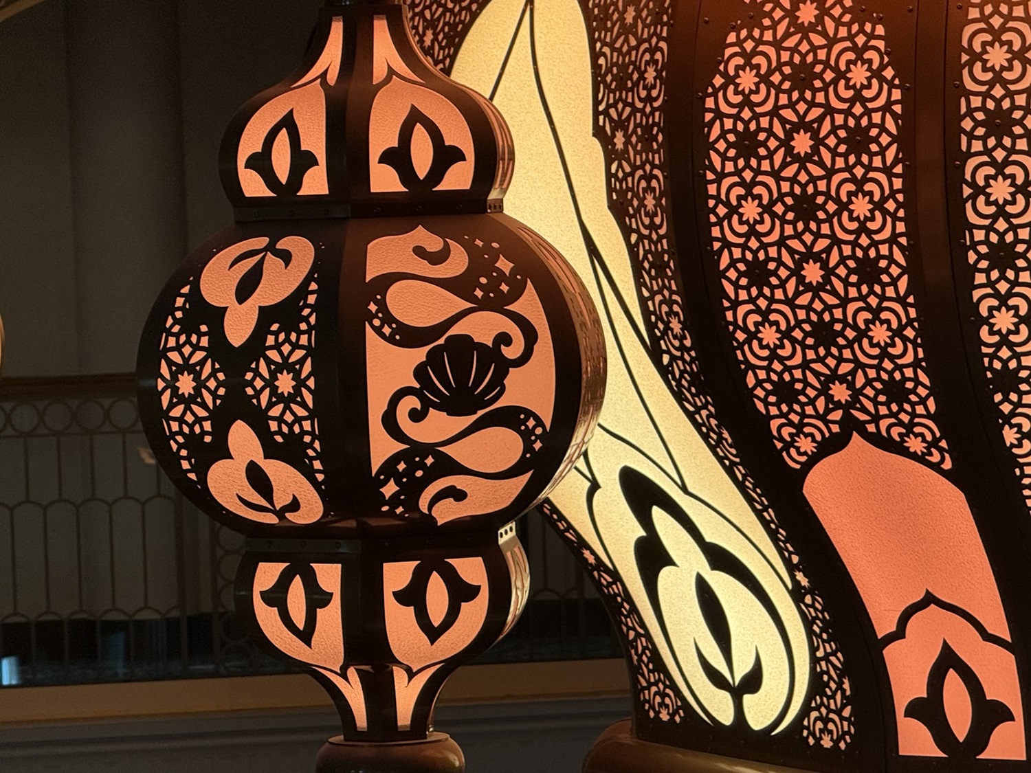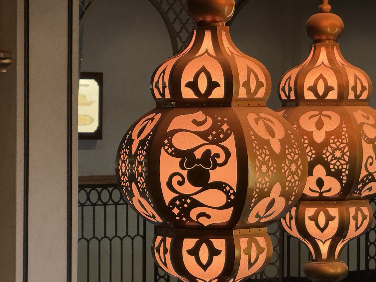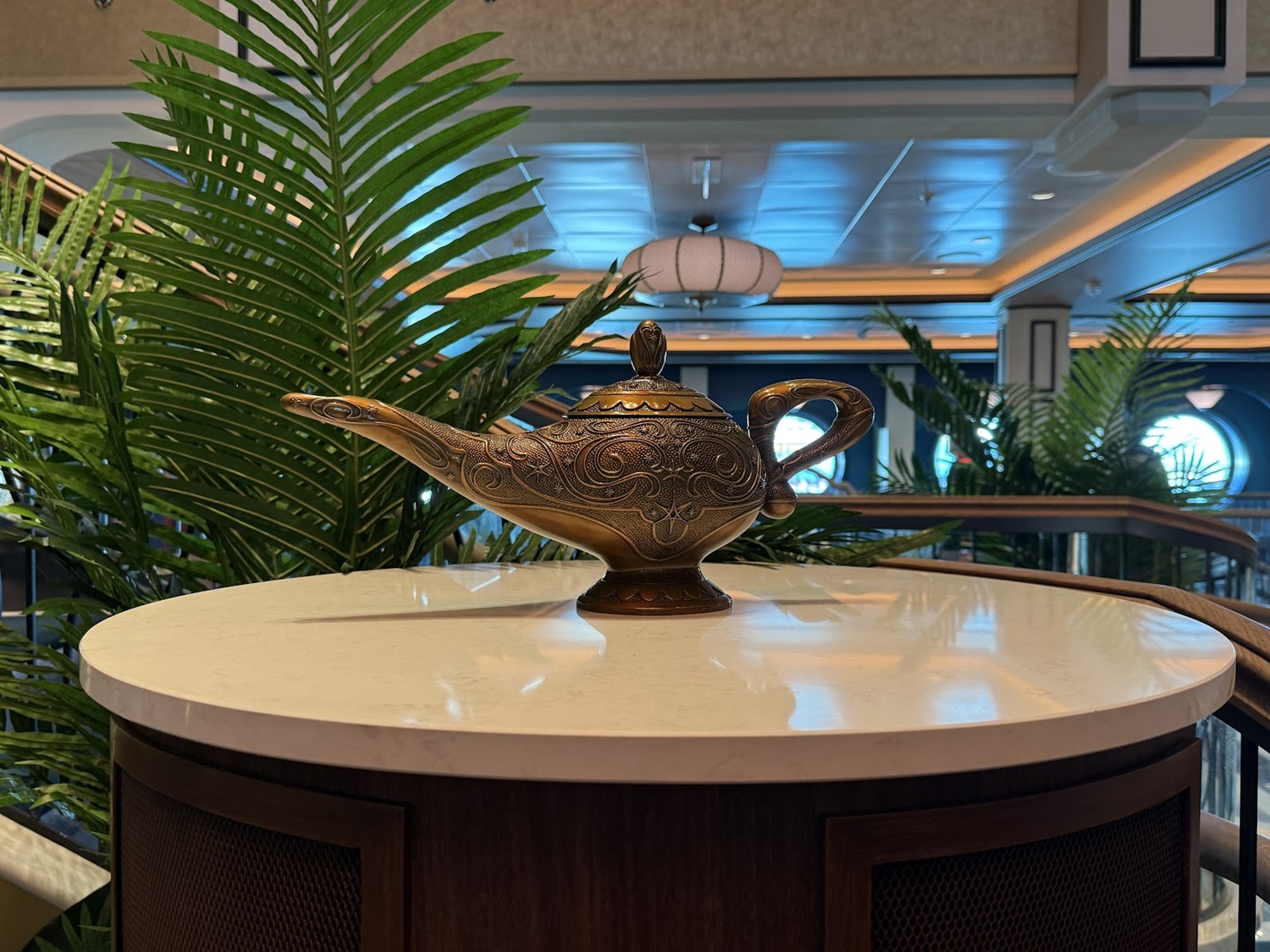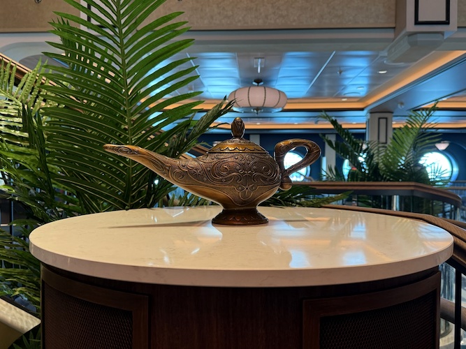 Self-awareness is key, right? The Disney Treasure is the sixth ship in the fleet, and features Aladdin, Jasmine, and Magic carpet as the atrium statue. With the Genie’s lamp prominent in this lantern, this clues us in that the other references will likely be nods to the first five ships and their atrium statues.