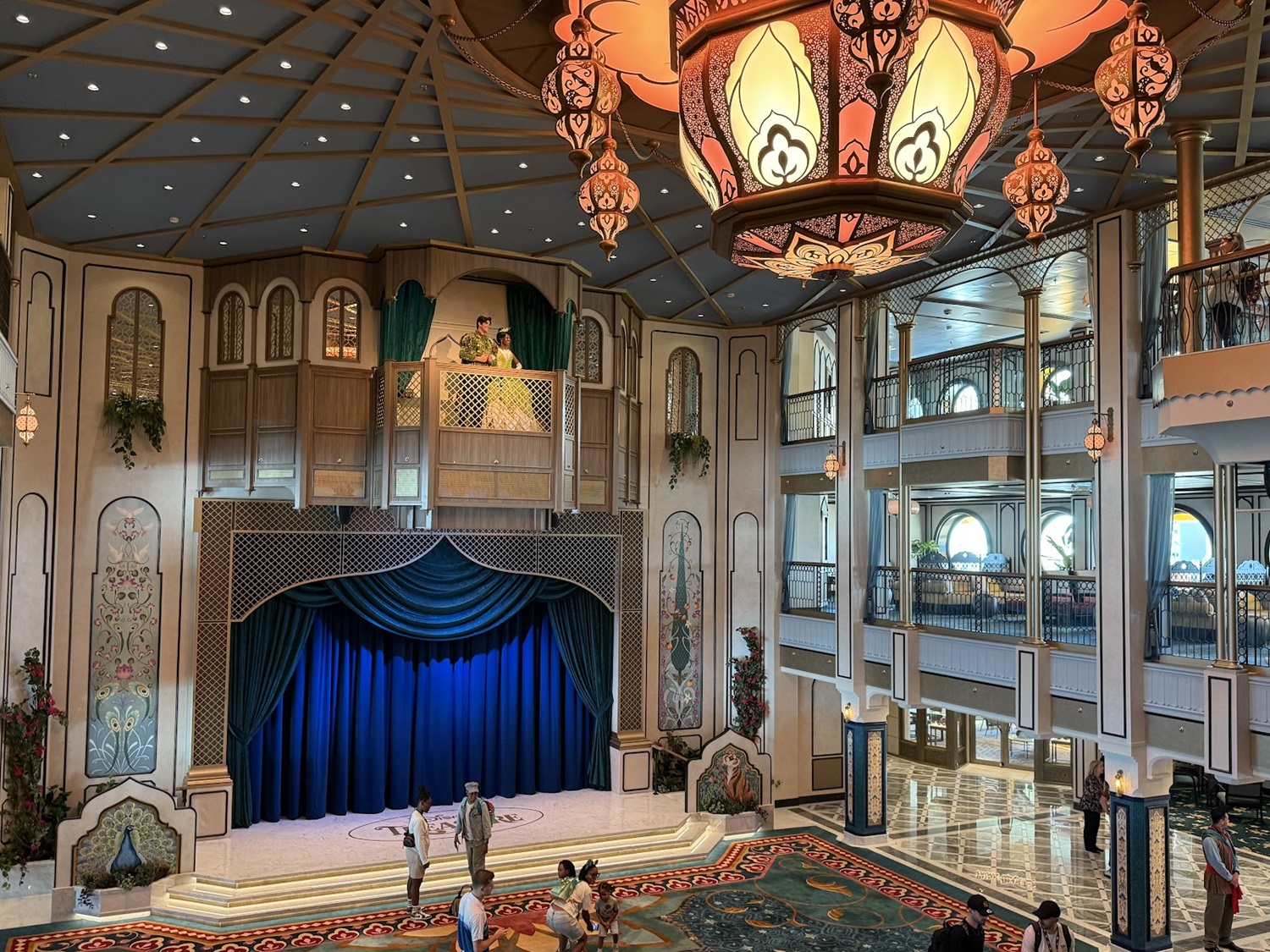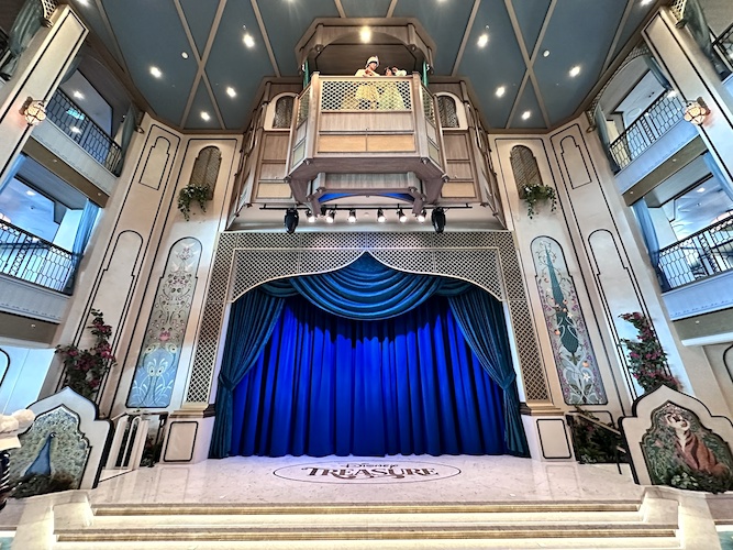 The Grand Hall, similar to the Disney Wish, not only features the signature statue, but also a large stage for performances throughout the voyage.