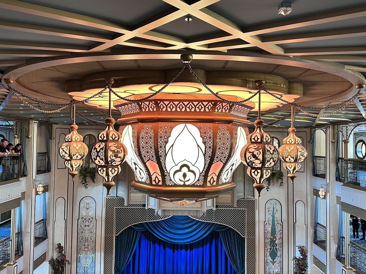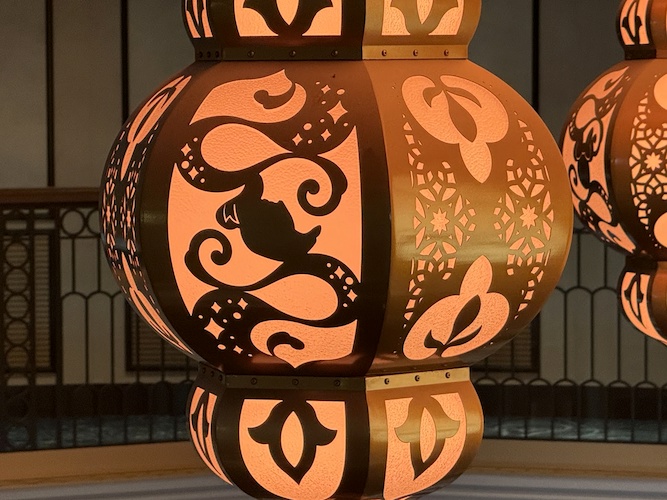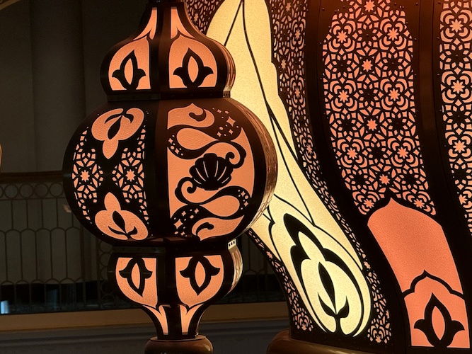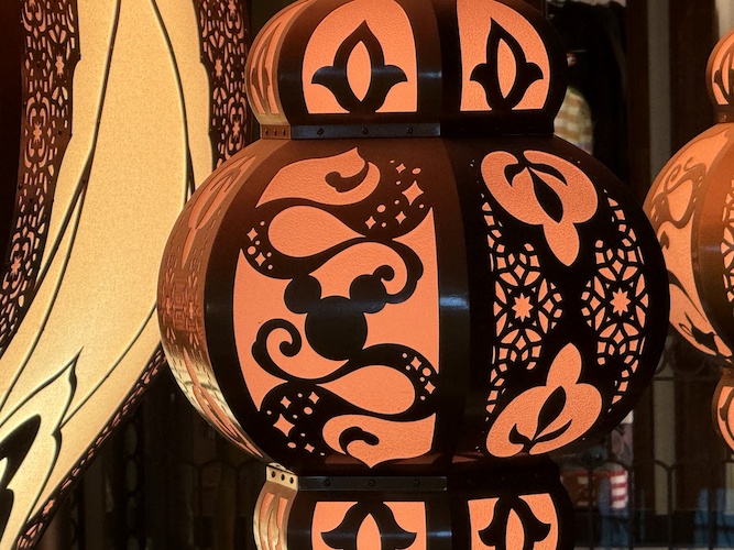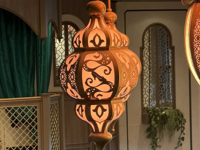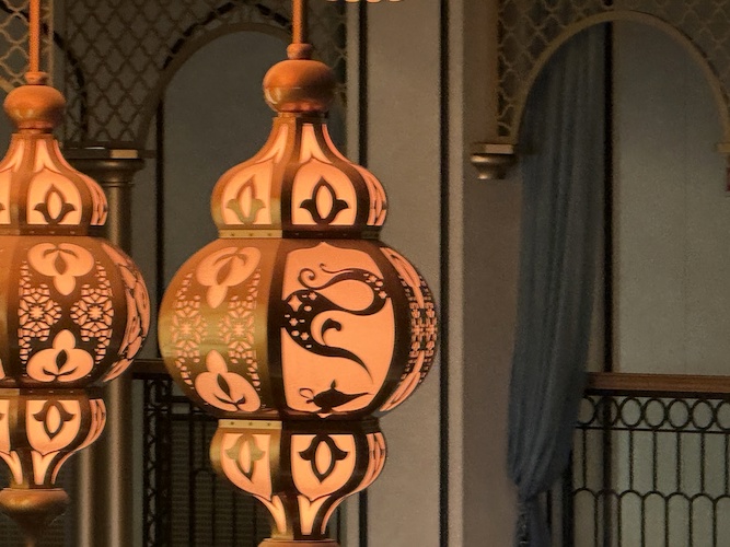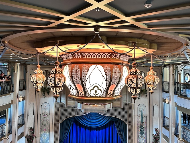 Nearby, guests will also find the Magic Lamp, home of the Genie, but if they look up, they’ll also see a stunning lighting fixture, that similar to its counterpart aboard the Disney Wish, comes to life sporadically with brilliant color and sound.