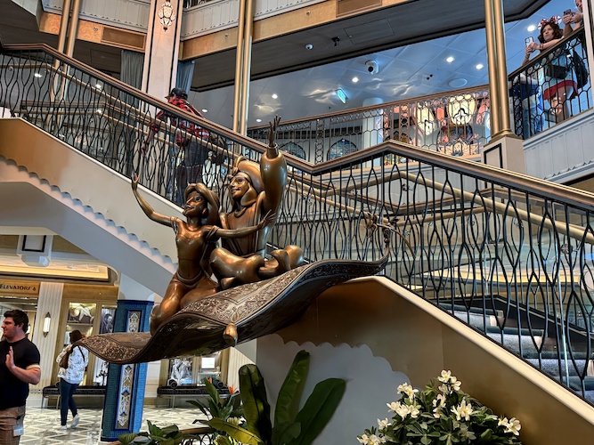 Guests entering the Grand Hall aboard the new Disney Treasure will be greeted by the new statue of Aladdin, Jasmine, and Magic Carpet. The statue, a signature item for each Disney Cruise Line ship that features unique characters on each vessel, isn’t the only thing that pays homage to this nautical tradition on board.