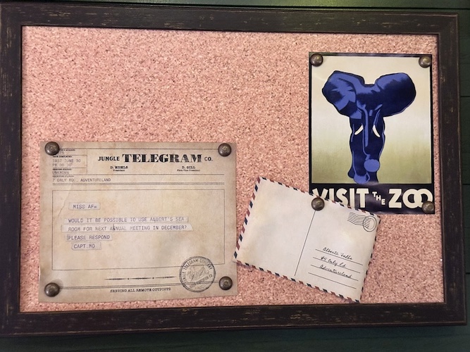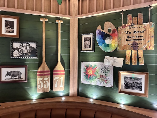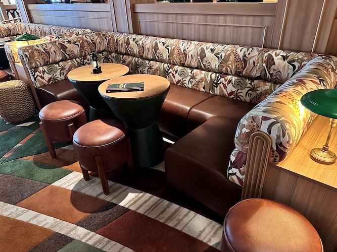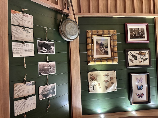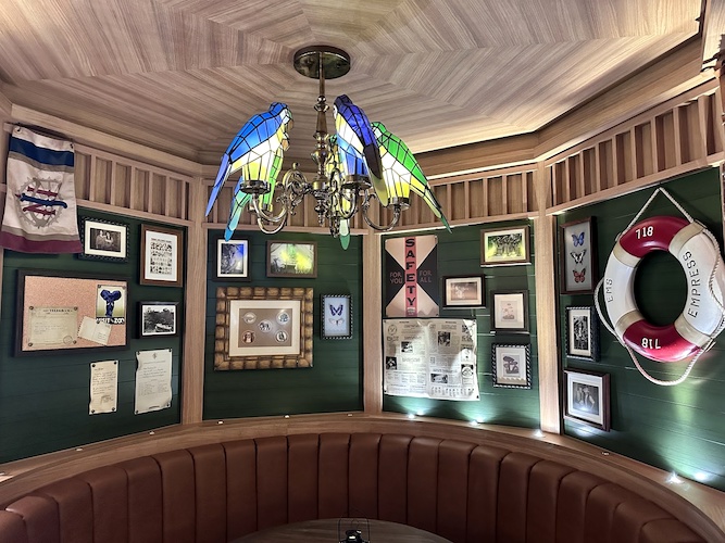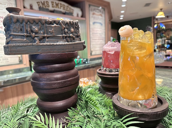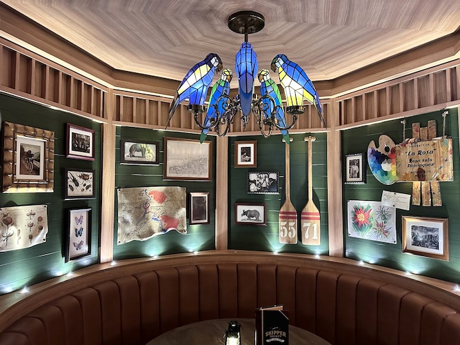 Adventure awaits guests beneath a tangle of foliage at Skipper Society, a centrally located lounge that will feature refined nods to the aforementioned attraction. Glassware carries over that theme with an elaborately sculpted glass replicating a Jungle Cruise boat.