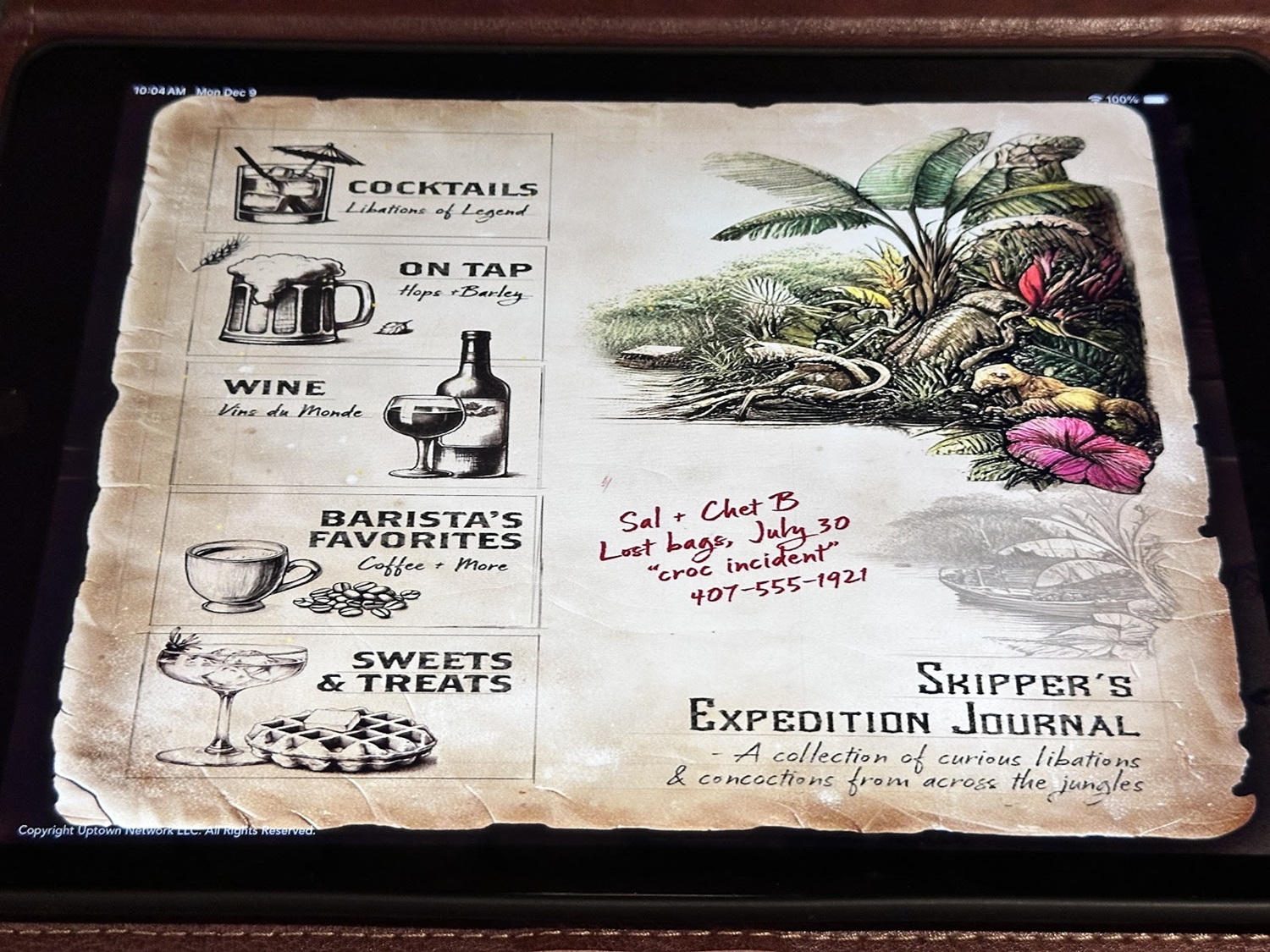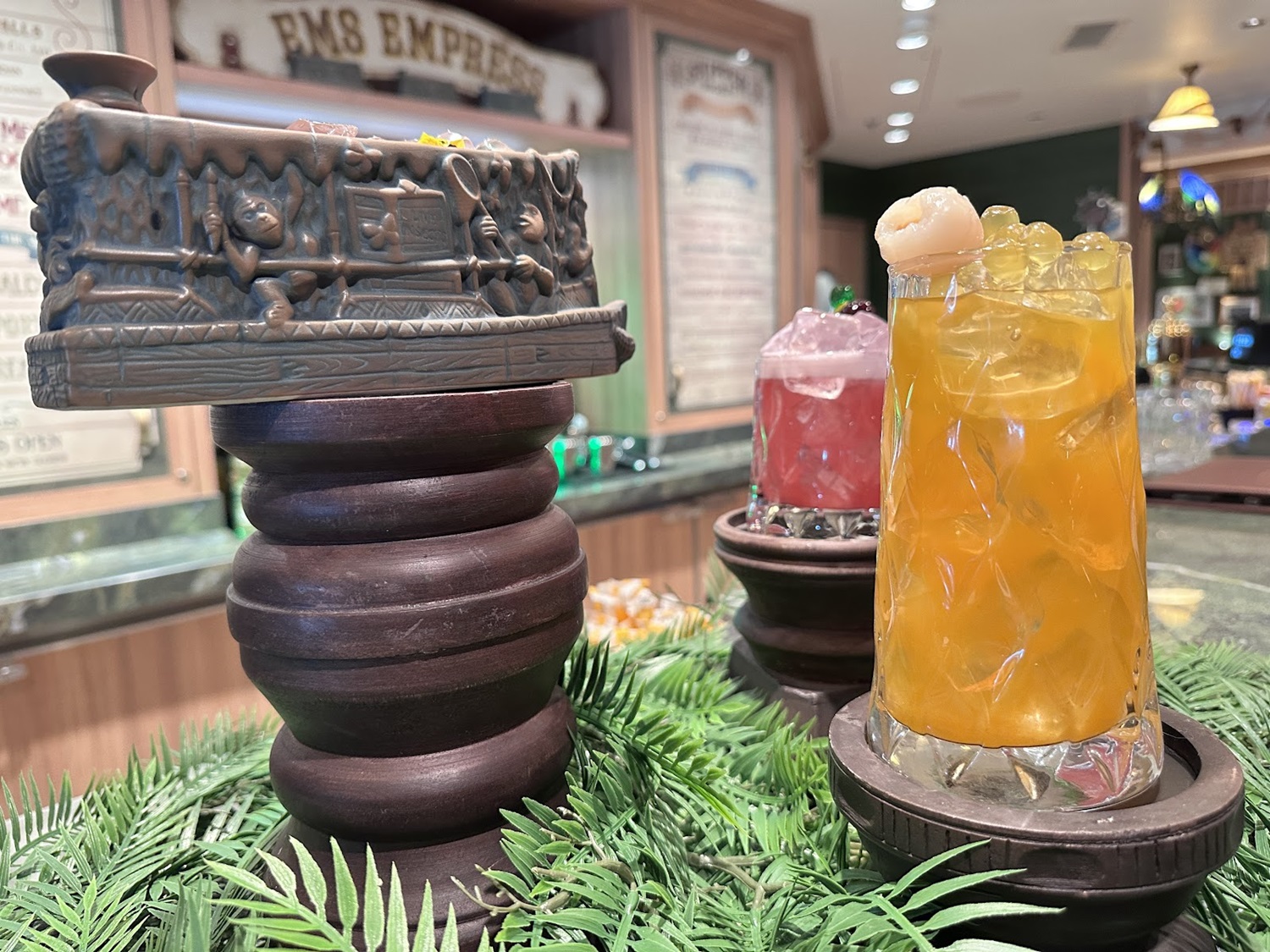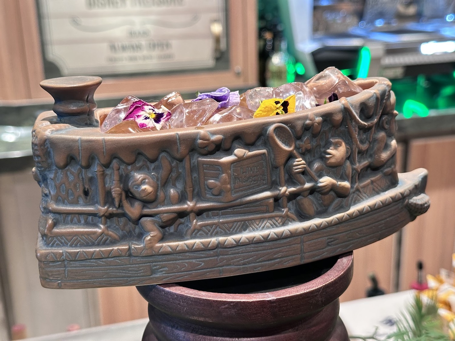 Adventure awaits guests beneath a tangle of foliage at Skipper Society, a centrally located lounge that will feature refined nods to the aforementioned attraction. Glassware carries over that theme with an elaborately sculpted glass replicating a Jungle Cruise boat.