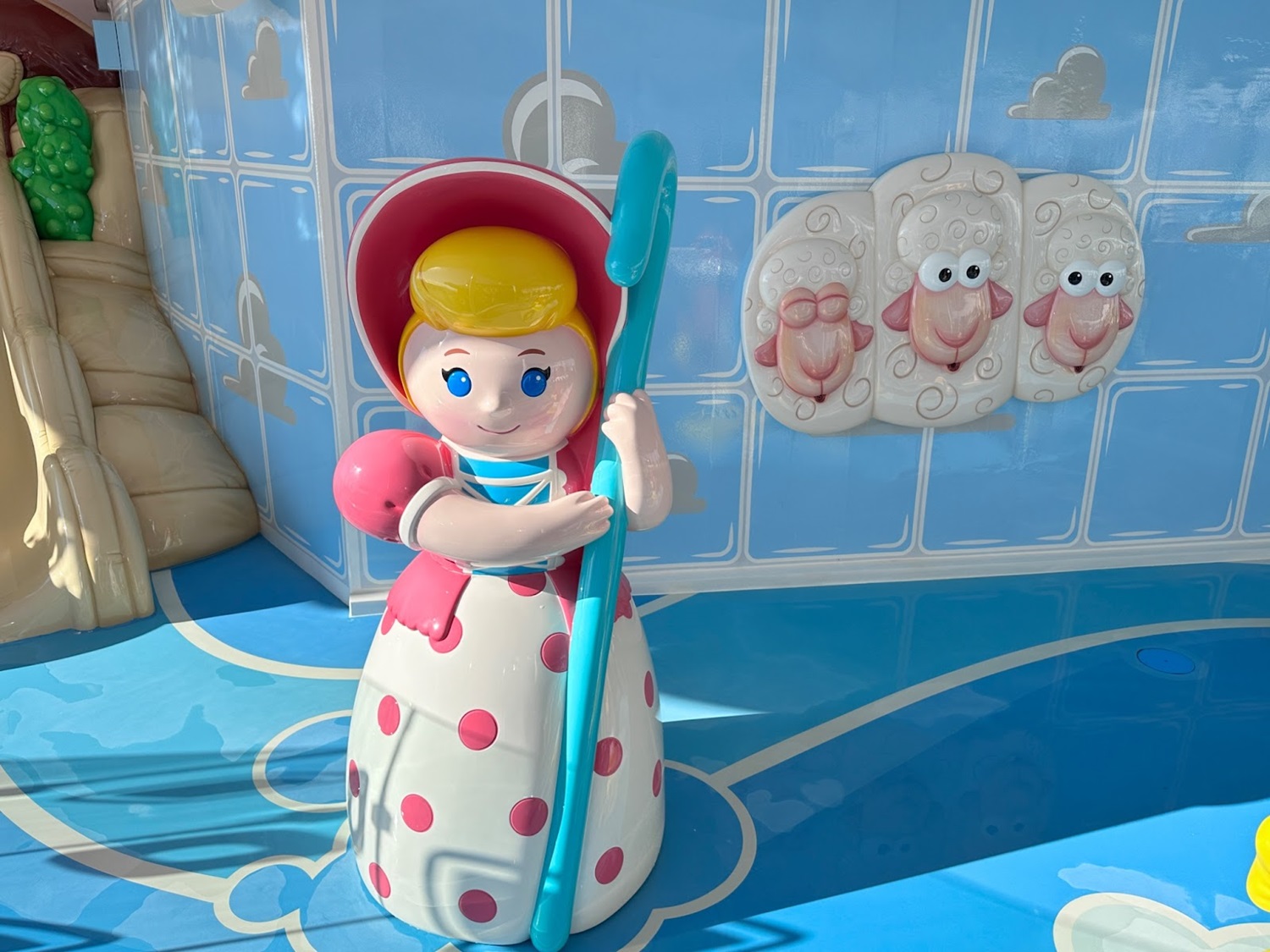 The area, which is available for kids up to the age of 6, features large figures of Toy Story characters like Woody, Buzz, Bo Peep and Jessie, but in the form of oversized rubber bath toys that move and spray water.