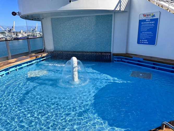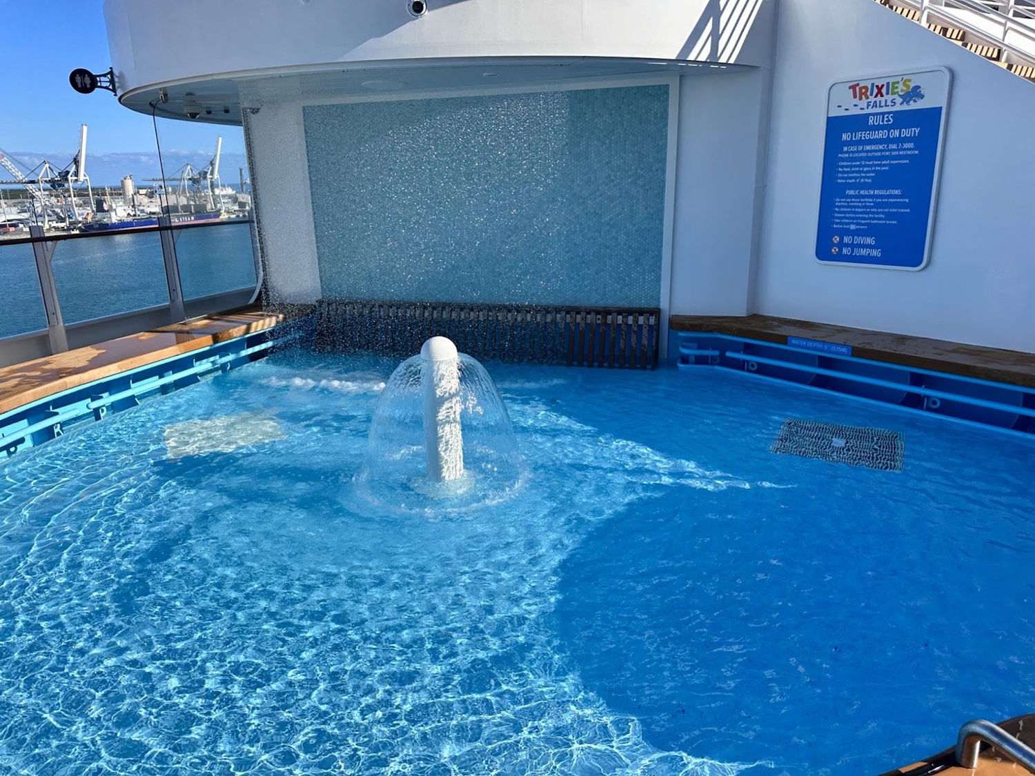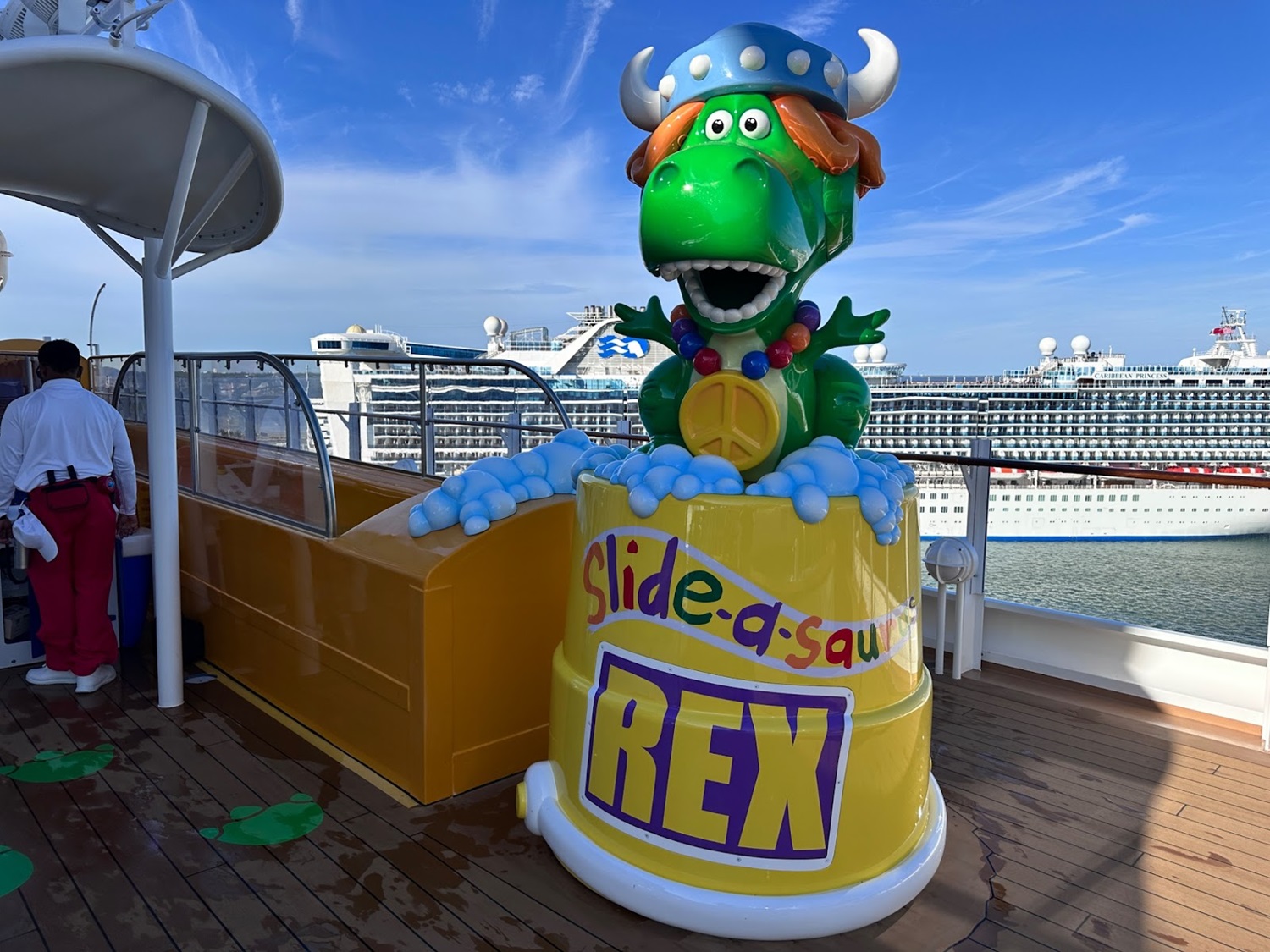 All the elements from the Wish incarnation of the Toy Story Splash Zone have been ported to the Treasure, Including the Slide-a-Saurus Rex kids water slide, pop jets, geysers, and bubblers, along with Trixie’s Falls, a six-inch-deep wading pool with a small fountain and waterfall.