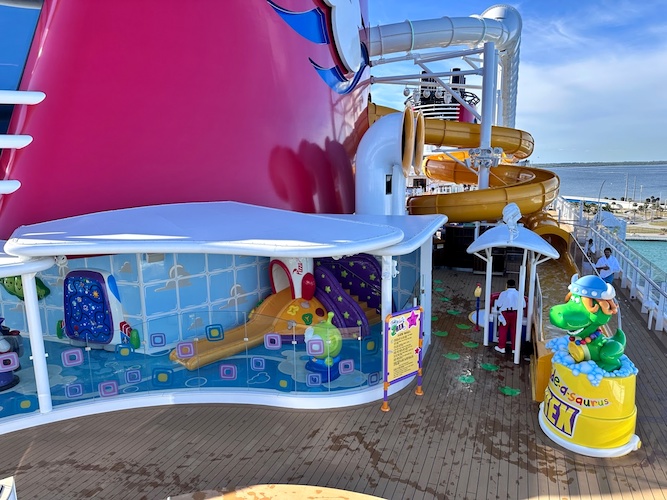 The new Disney Treasure features the Toy Story Splash Zone, a children’s splash pad area first introduced to the Disney Cruise Line on the Disney Wish.