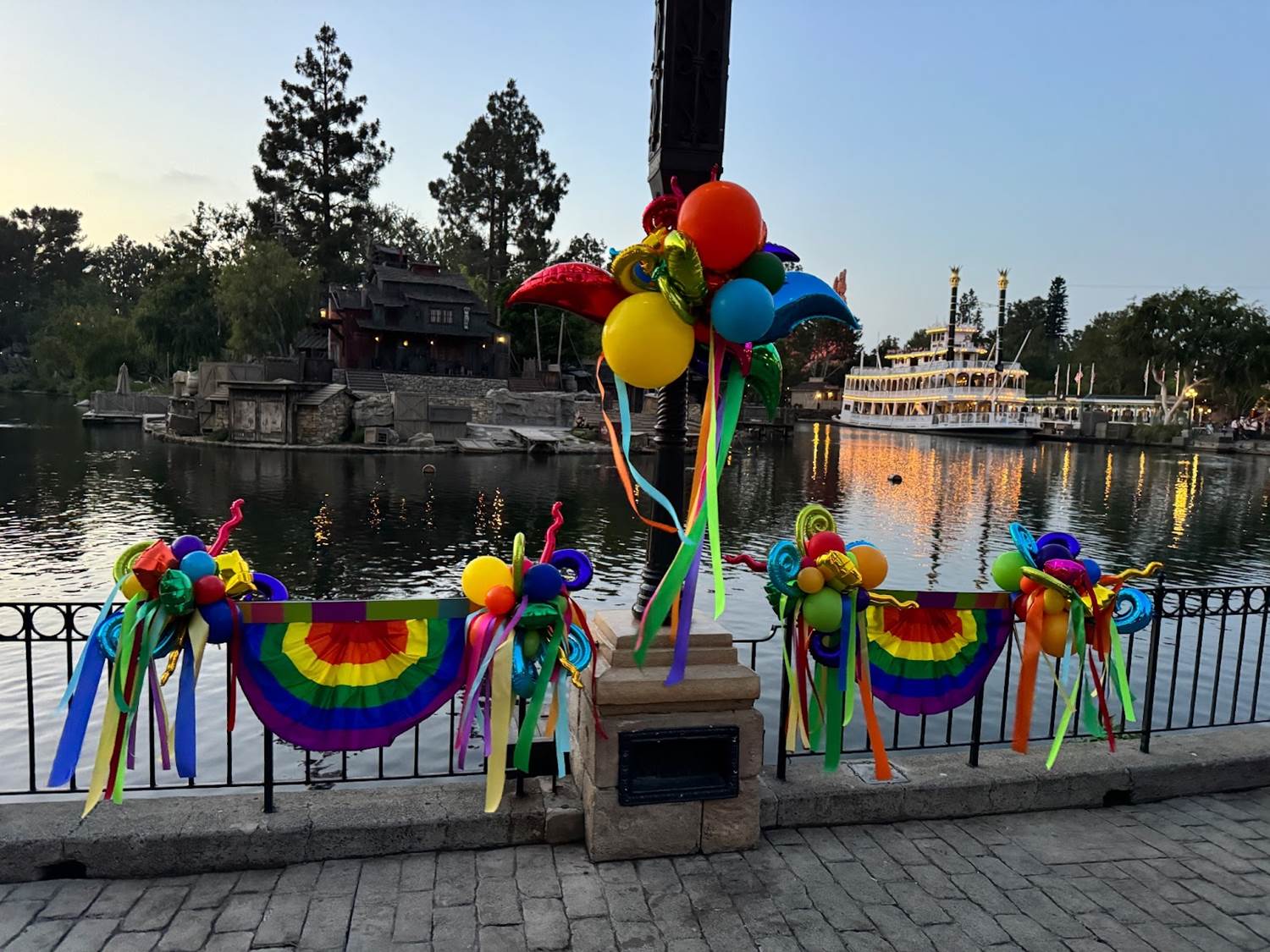 Rainbow colored balloons and bunting decorated the shores of the Rivers of America, which also served as home to a fun dance party along the water’s edge.
