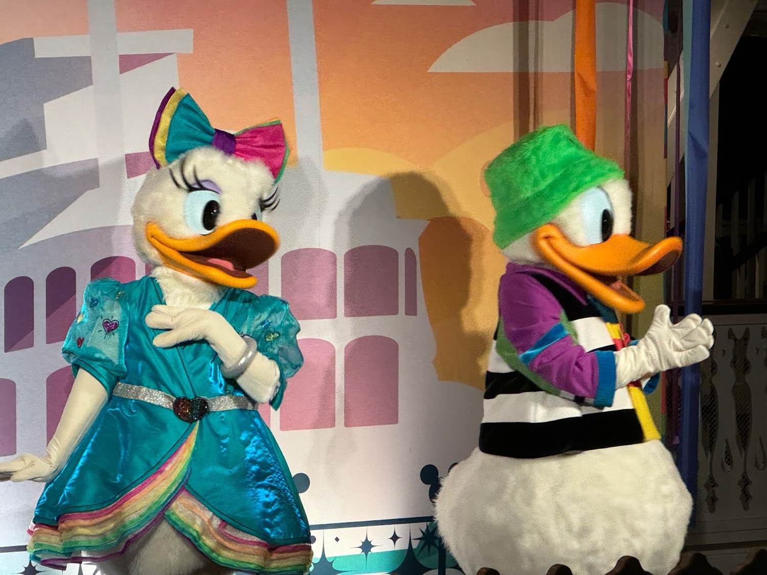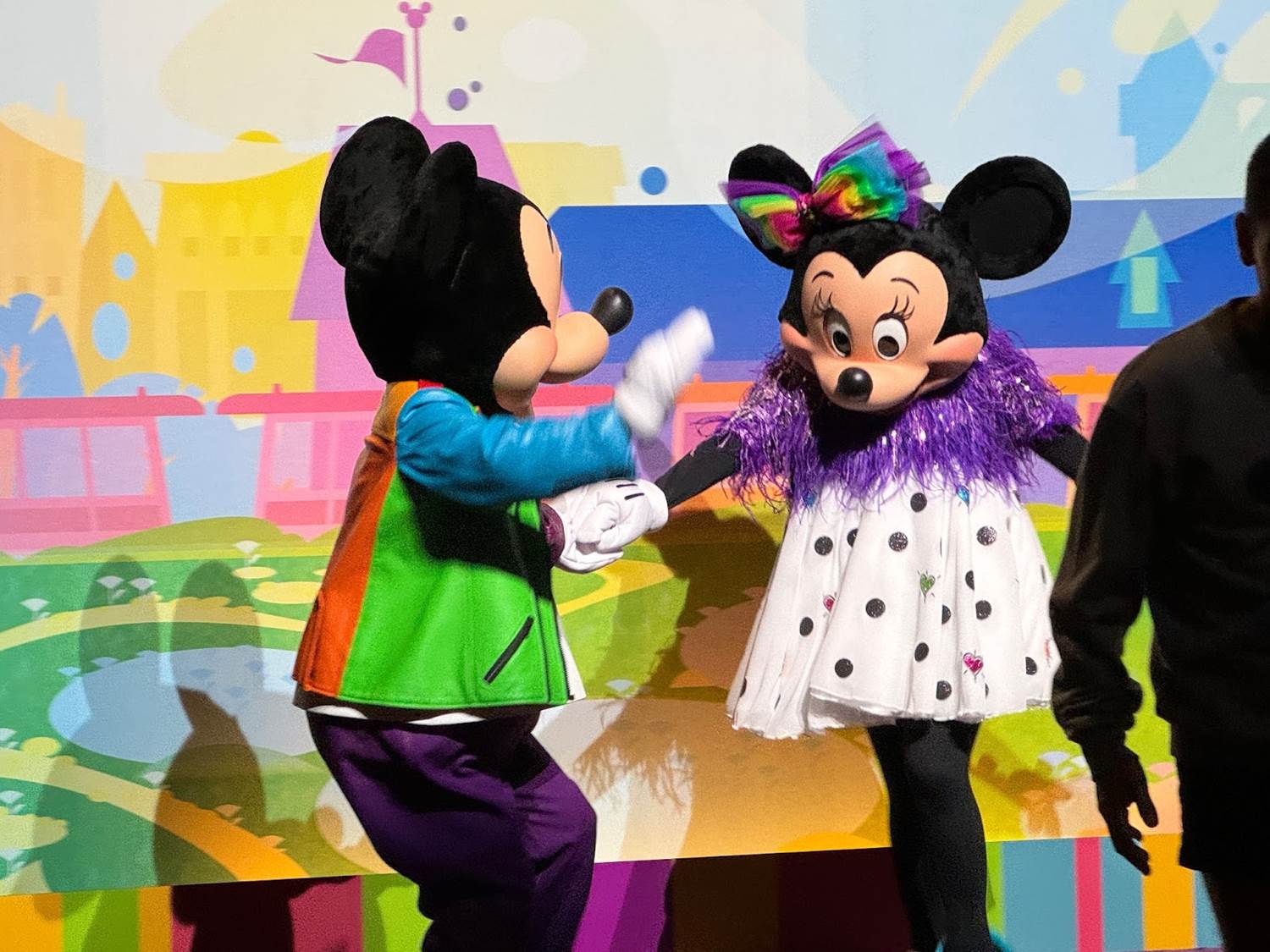 Mickey, Minnie, Donald and Daisy donned colorful outfits for the event, posing in front of an equally colorful backdrop of Disneyland.