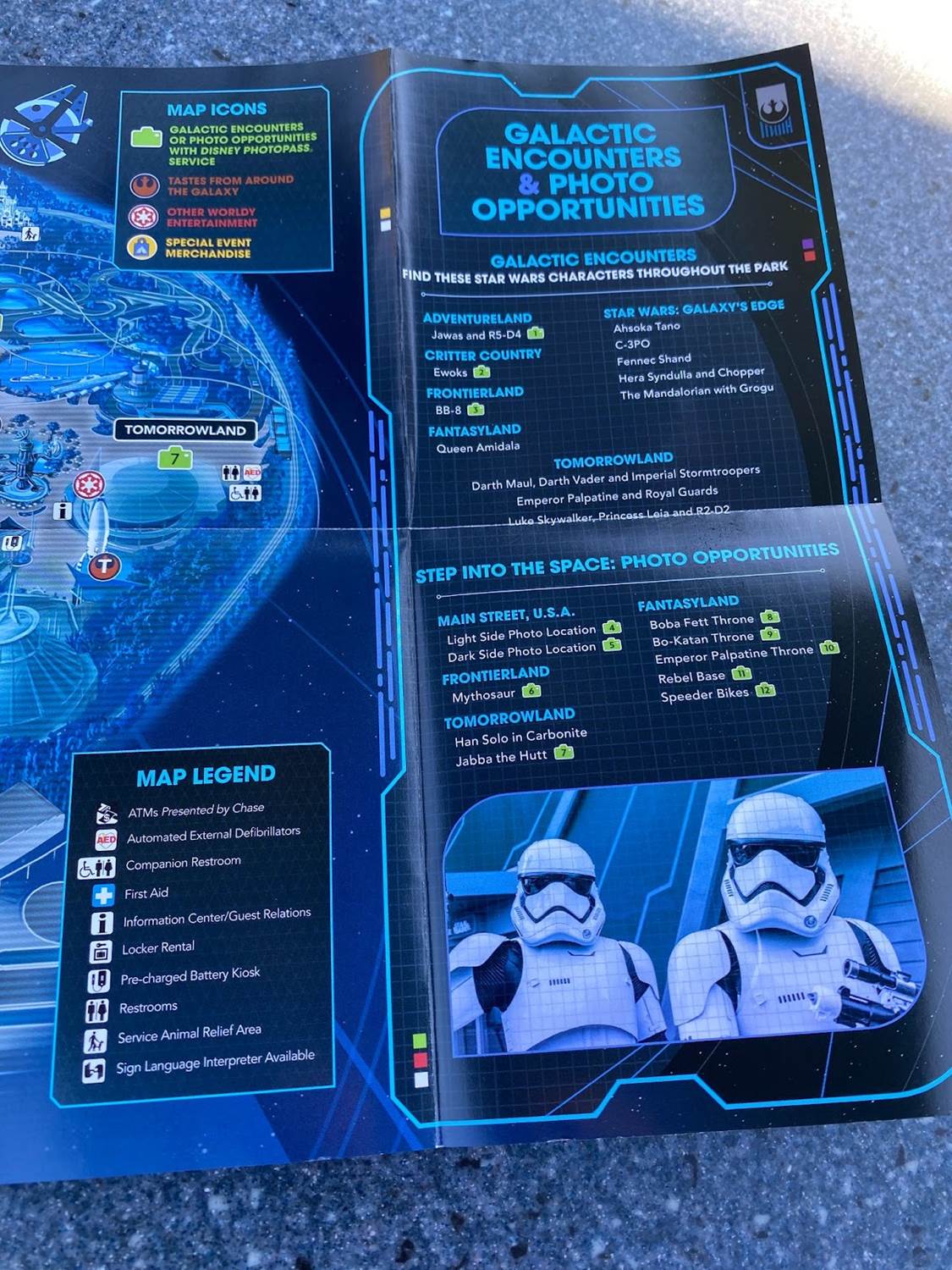 The remaining panels of the guide map contain information about merchandise, complimentary Disney PhotoPass images, and an ad for the Best of Star Wars Playlist from Walt Disney Records.