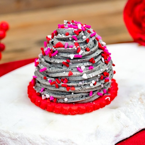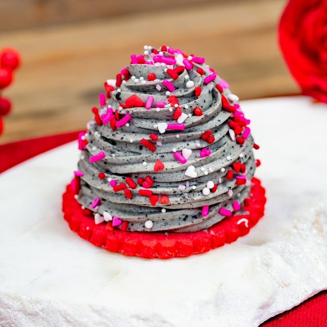 - Red Velvet Grey Stuff: Red shortbread cookie, red velvet cake, raspberry, cookies and cream mousse, and heart sprinkles