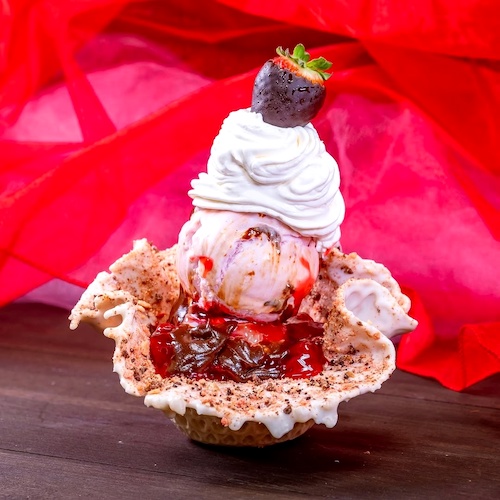 - Chocolate-covered Strawberry Sundae: Chocolate and strawberry ice creams, hot fudge, strawberry sauce, whipped cream, and chocolate-covered strawberry in a strawberry and brownie-dusted waffle bowl