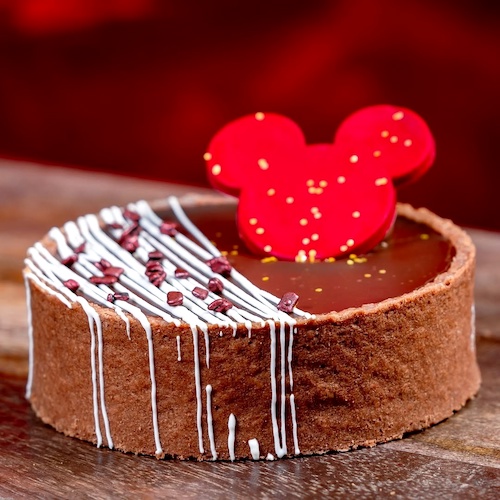 - Salted Chocolate Tart: Layers of chocolate cake, salted caramel and chocolate ganache in a chocolate tart shell, topped with Fleur de Sel, bronze sprinkles, and red-colored chocolate Mickey decoration