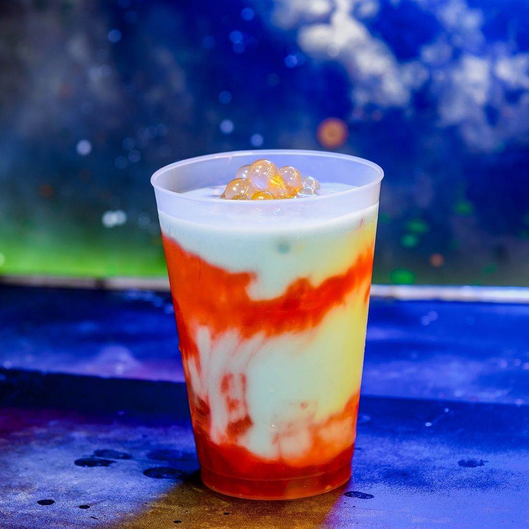- Blue Milk with Golden Lichen paddy Frog Eggs: Blue Milk with strawberry puree lychee popping spheres at Milk Stand.