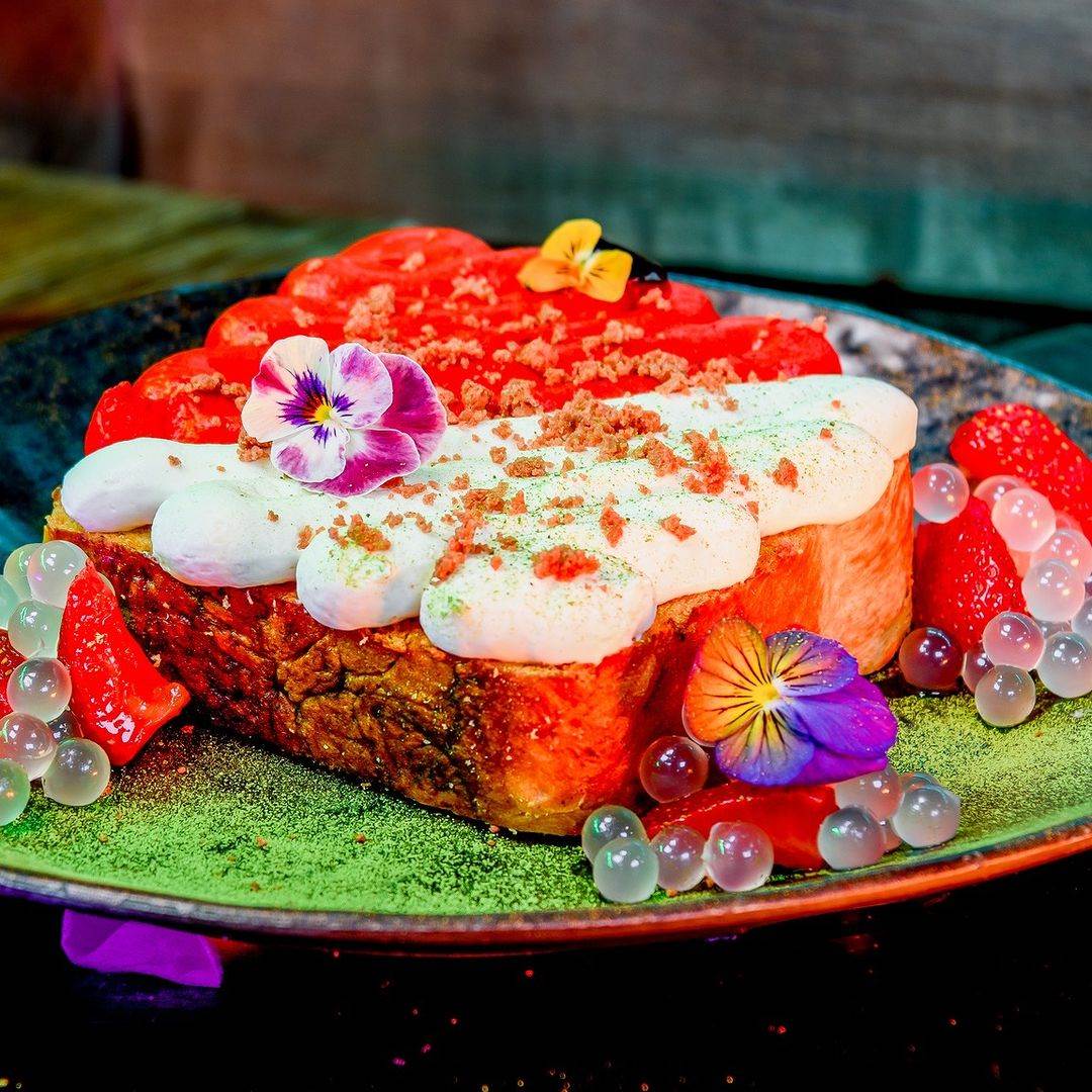 - Millaflower Toast: Cinnamon-swirl toast, whipped ricotta cream, cheesecake frosting, strawberries, lychee pearls, chocolate crumble, and matcha powder at Oga’s Cantina.