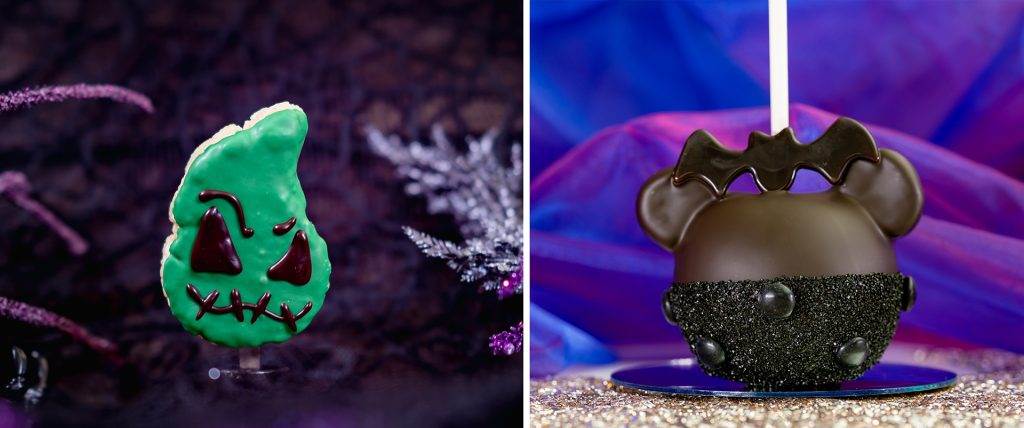- Black Bat Minnie Caramel Apple: Granny Smith apple dipped in caramel and decorated with dark chocolate-covered marshmallow ears, a black sugar dress, black M&M’S Milk Chocolate Candies, and a black dark chocolate bat bow (Available Aug. 23 through Oct. 31)