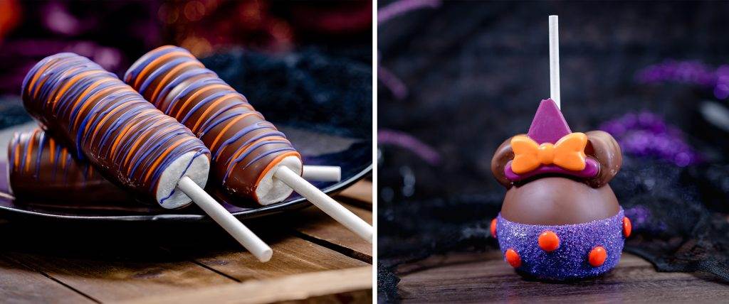 - Minnie Witch Caramel Apple: Granny Smith apple dipped in caramel and decorated with milk chocolate-dipped marshmallow ears, a purple skirt, orange M&M’S Milk Chocolate Candies, and a chocolate witch hat (Available Aug. 23 through Oct. 31)