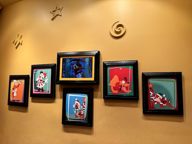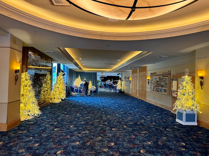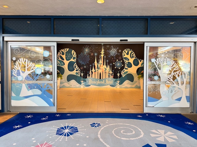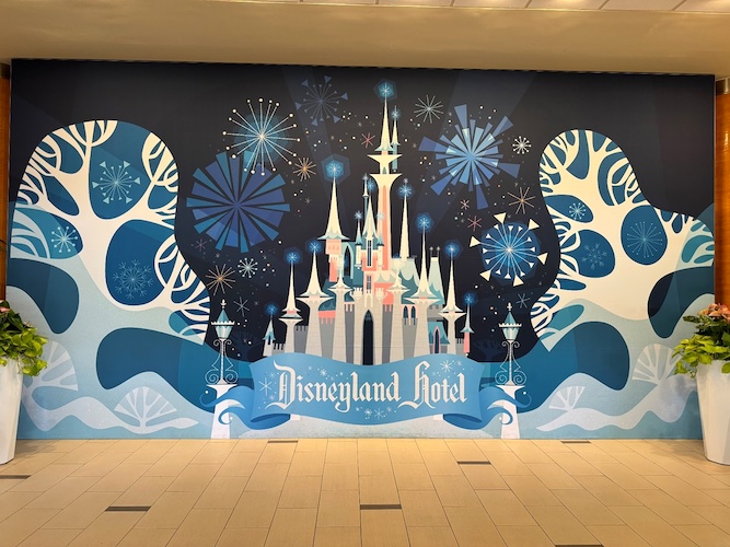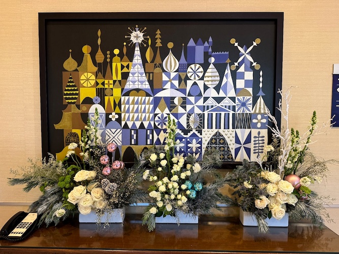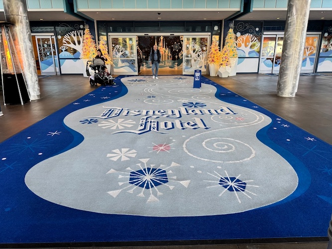 Guests entering the Disneyland Hotel’s front entrance are greeted by a festive carpet, with some beautiful artwork and decorations beckoning you inside. This artwork, designed by artist Hayden Evans, was introduced to the hotel last year.