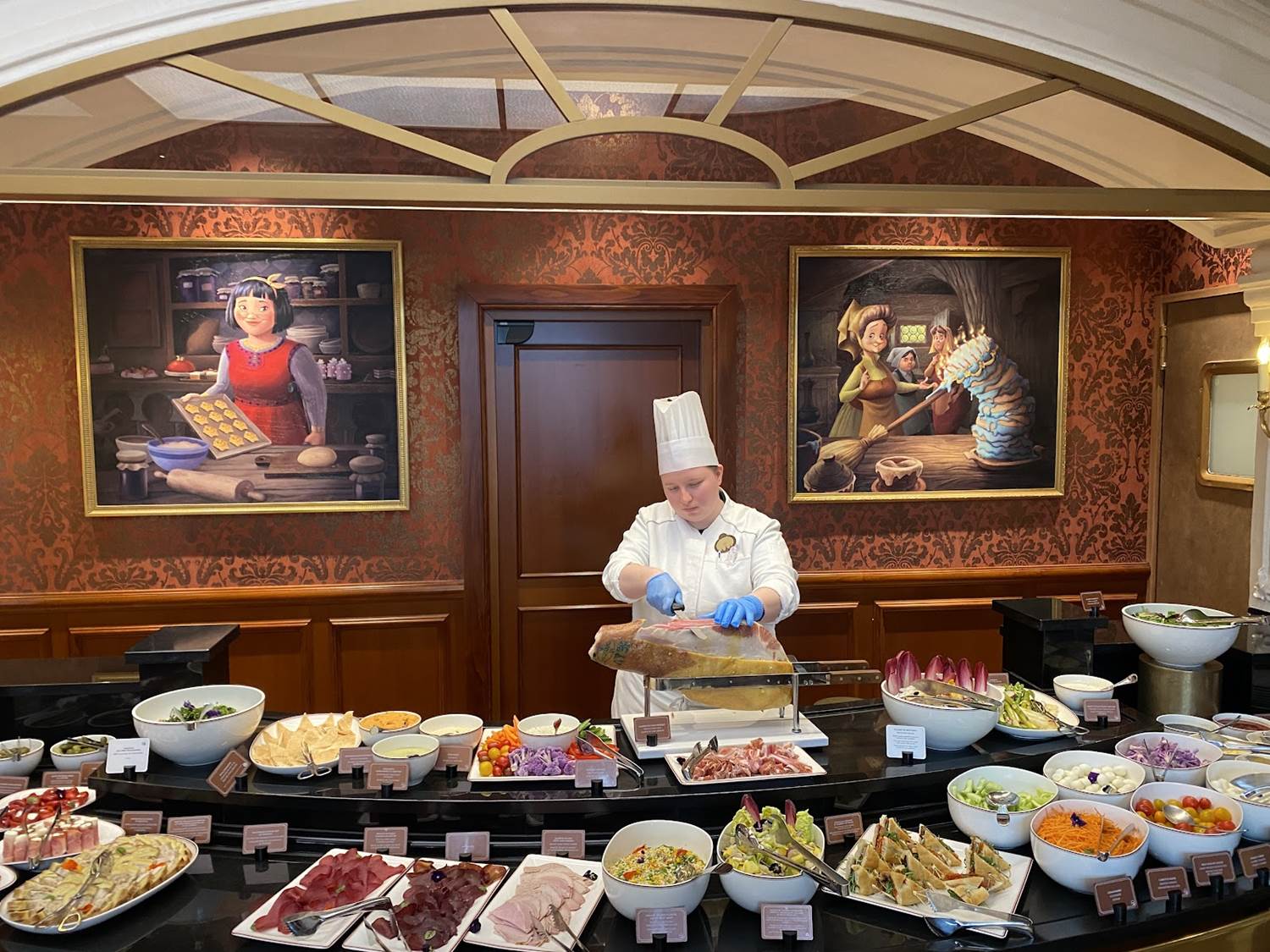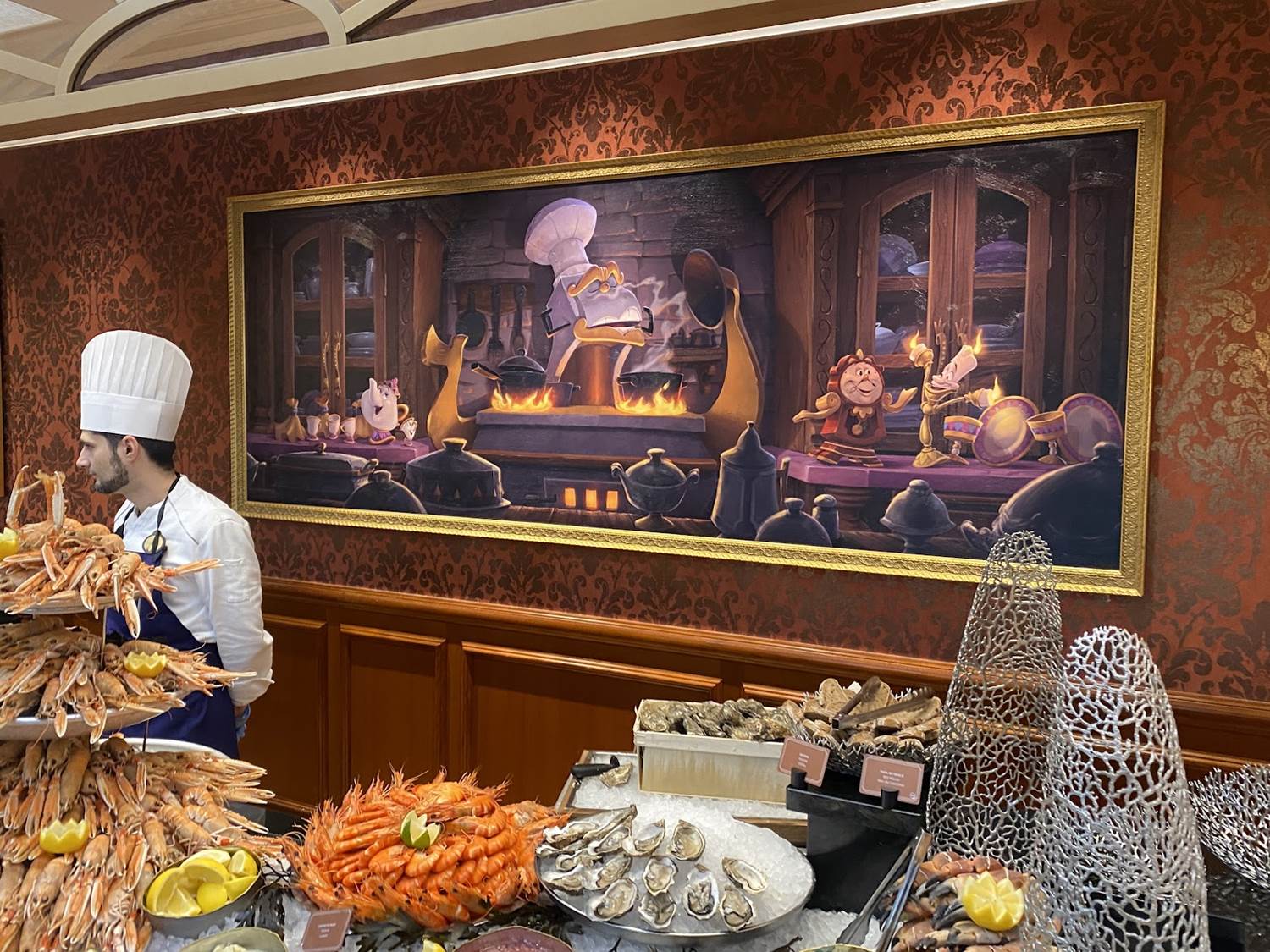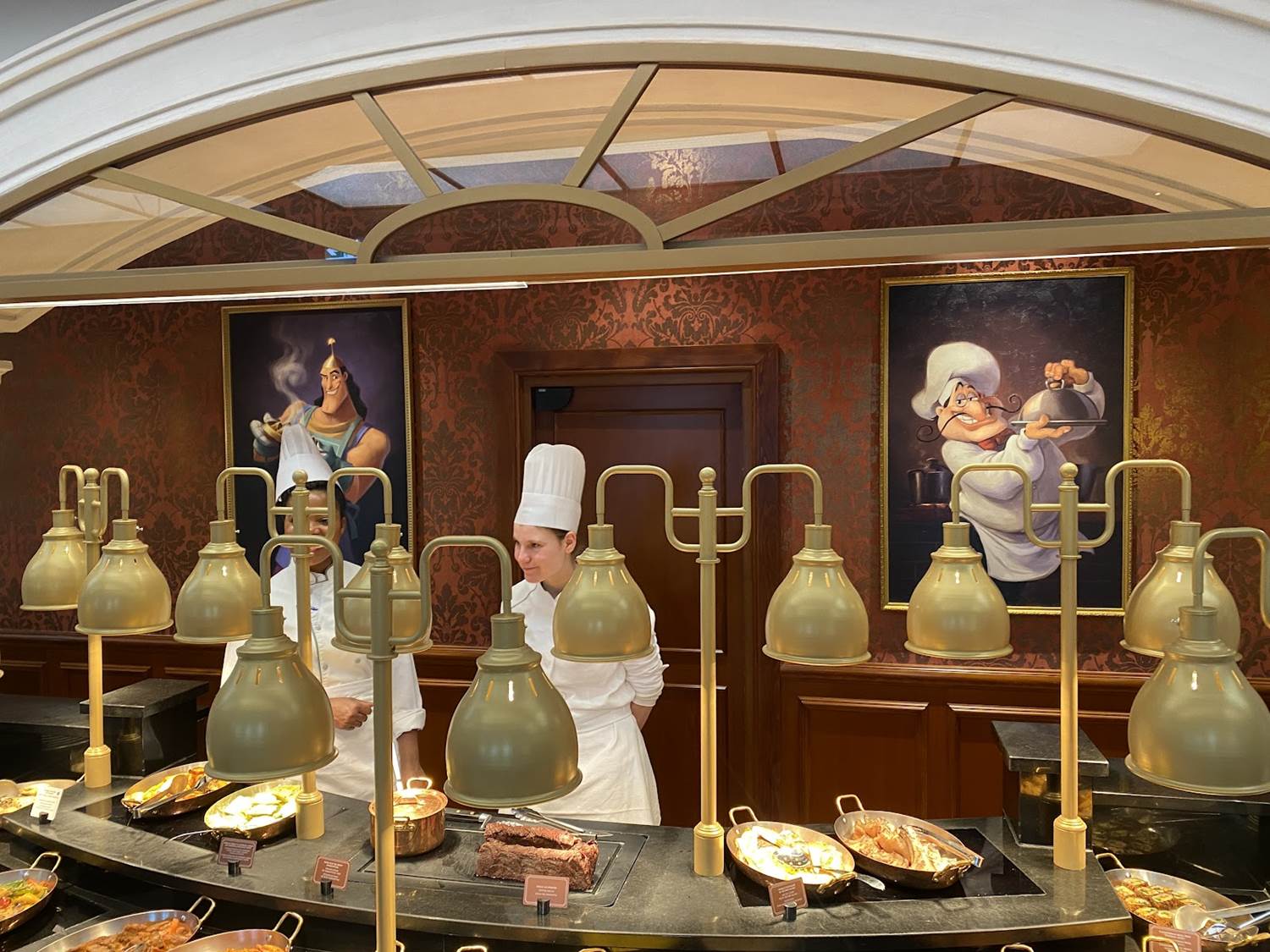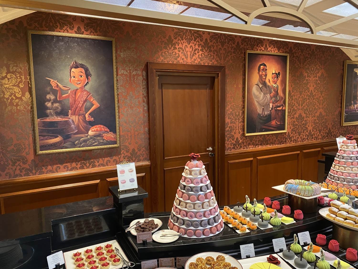 While you’ll be making hard choices at the sumptuous buffet, look above on the walls as they display characters famous for their culinary masterpieces (or legendary kitchen disasters)!