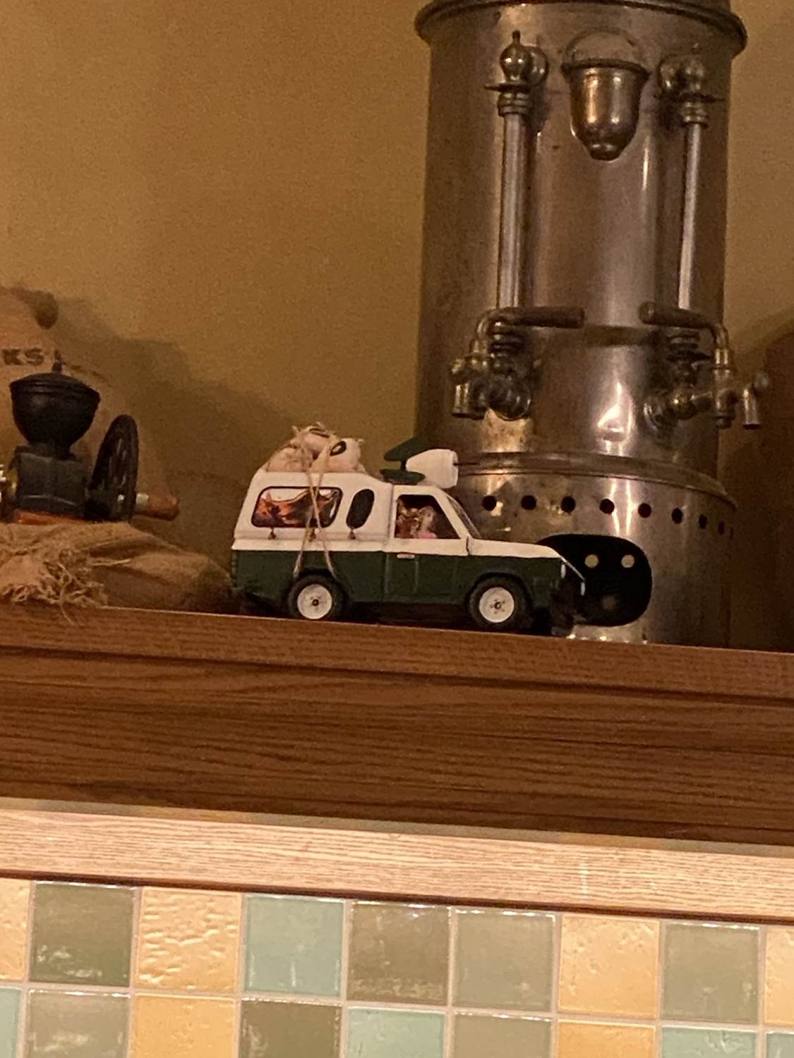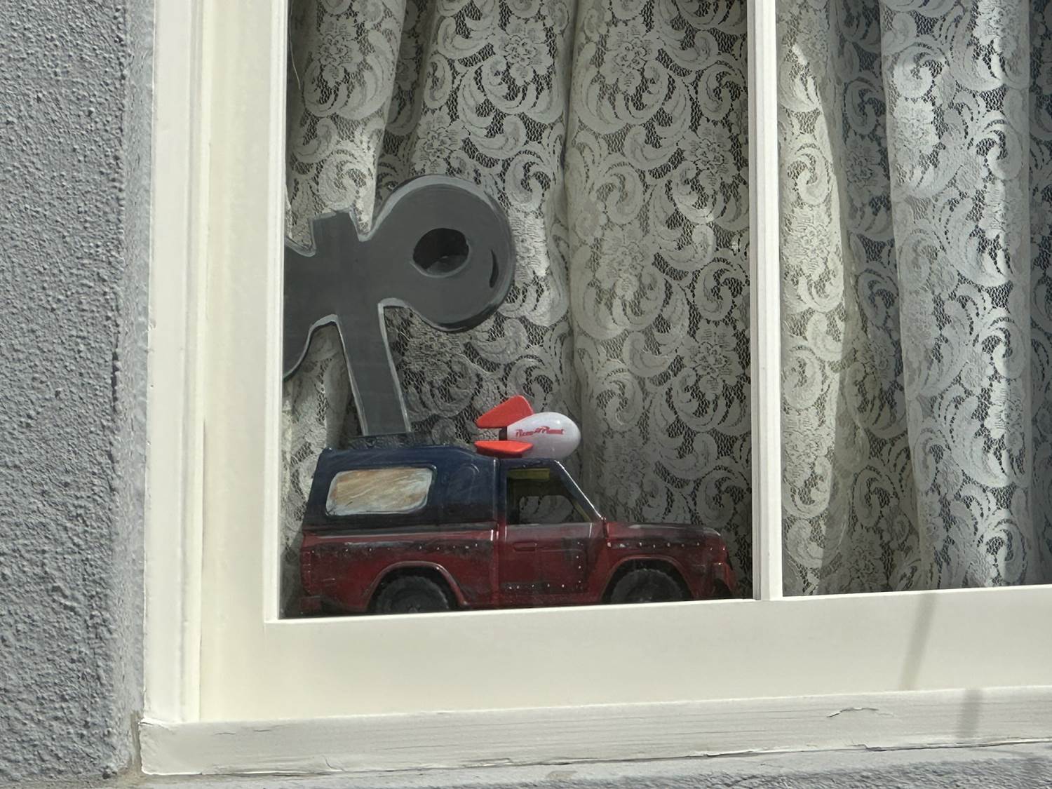 Looks like Goofy and Max need a break from modern livin’! They’re off “On the Open Road" in… wait… that’s not the car from A Goofy Movie, that’s a Pizza Planet Truck in disguise! Look high for a windowsill to find this little beauty.