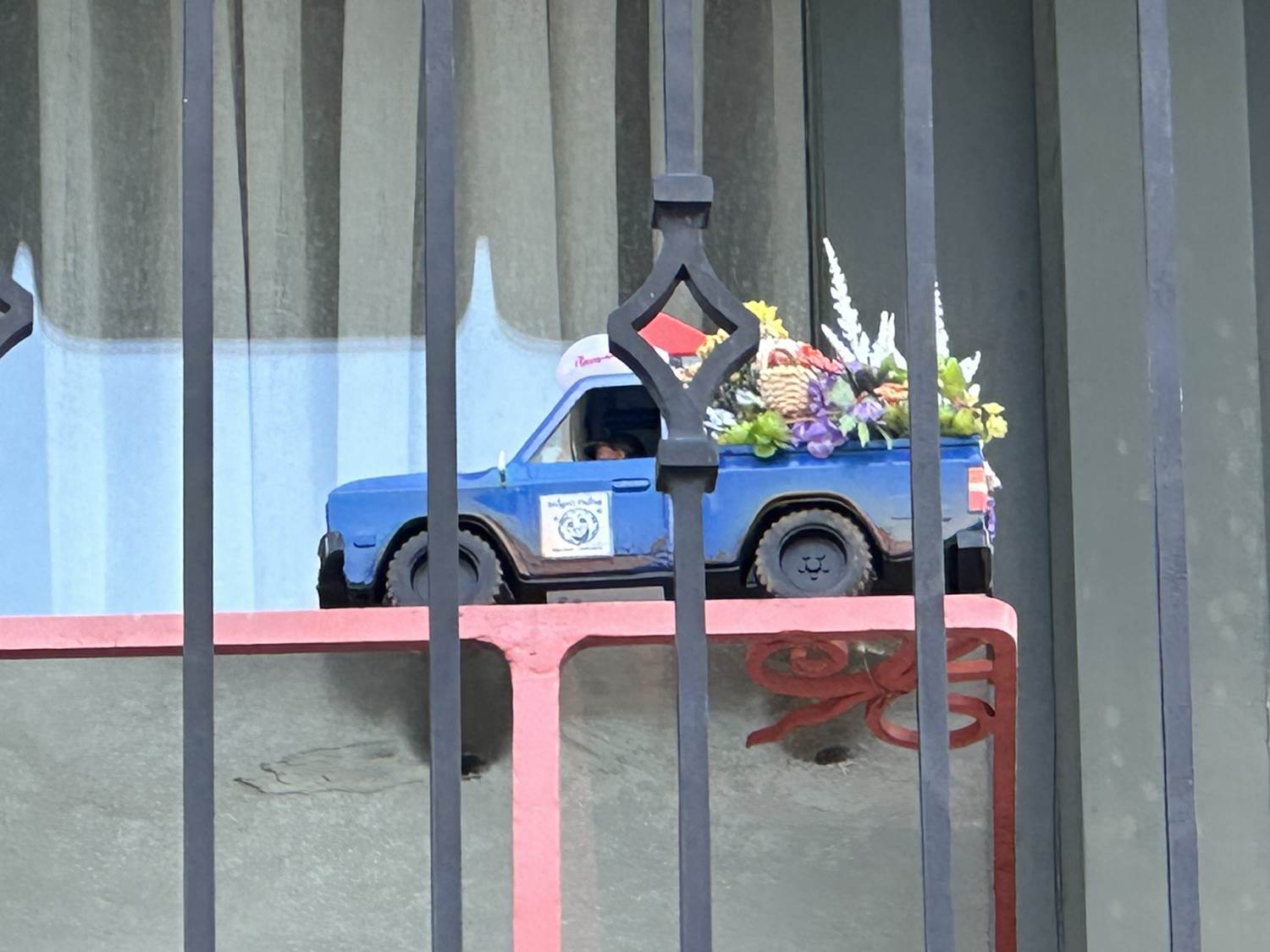 Flower delivery! You’ll find this one on a table on a balcony near the main entrance.