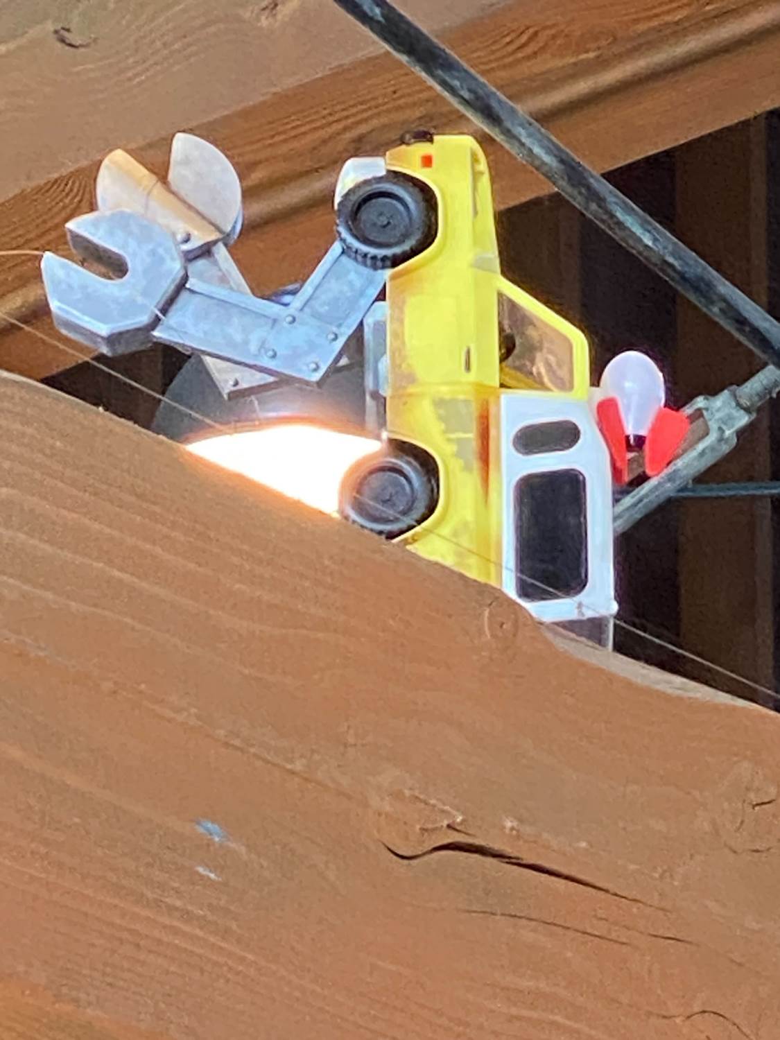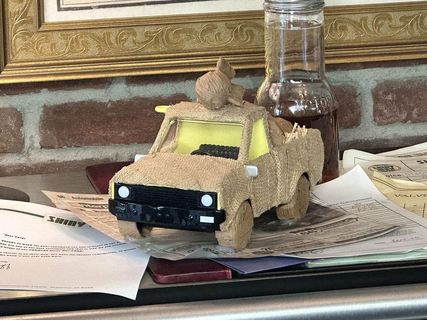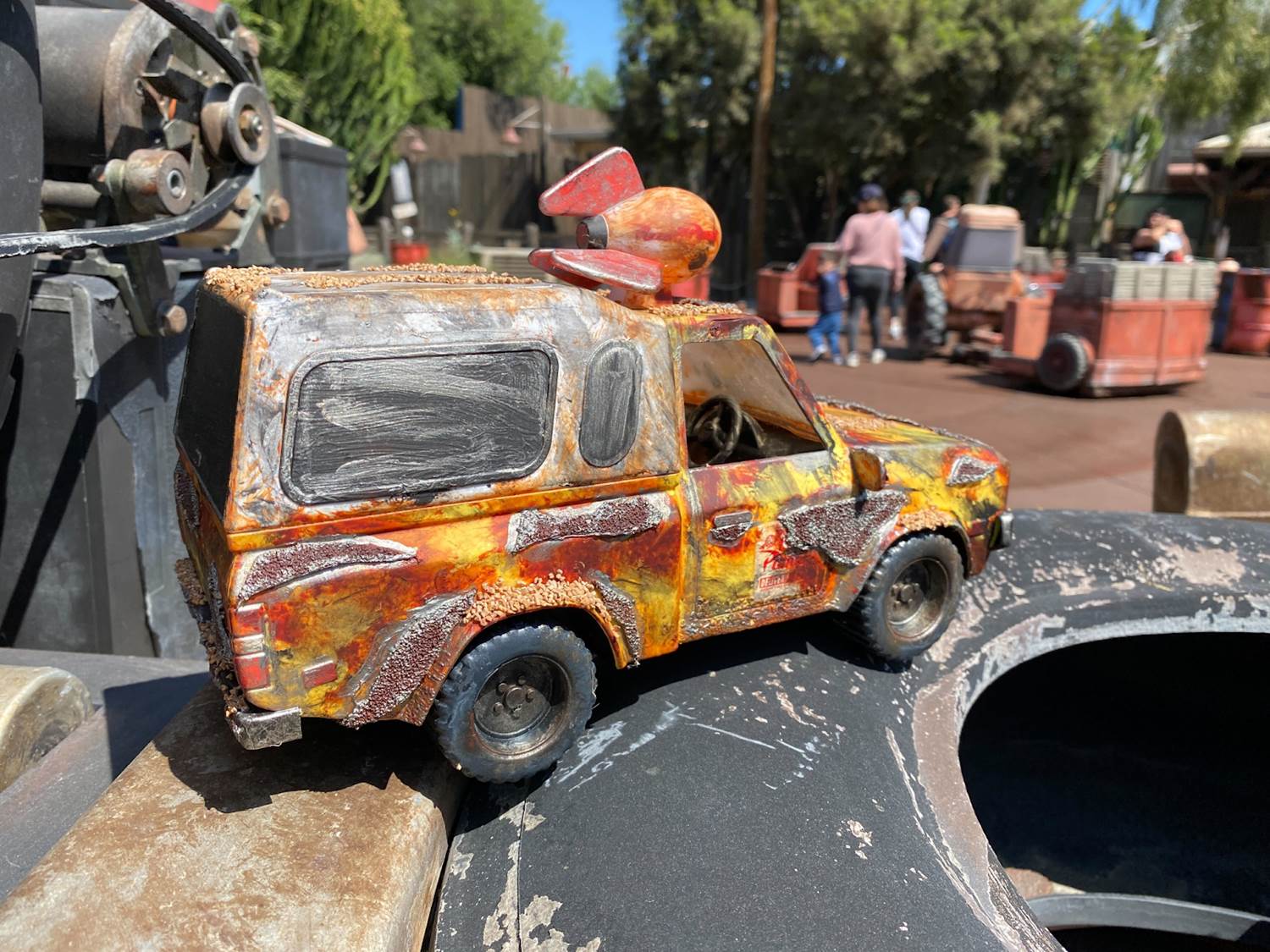 This rusty Pizza Planet Truck is ready to retire. It’s parked outside the giant jukebox made of car parts.