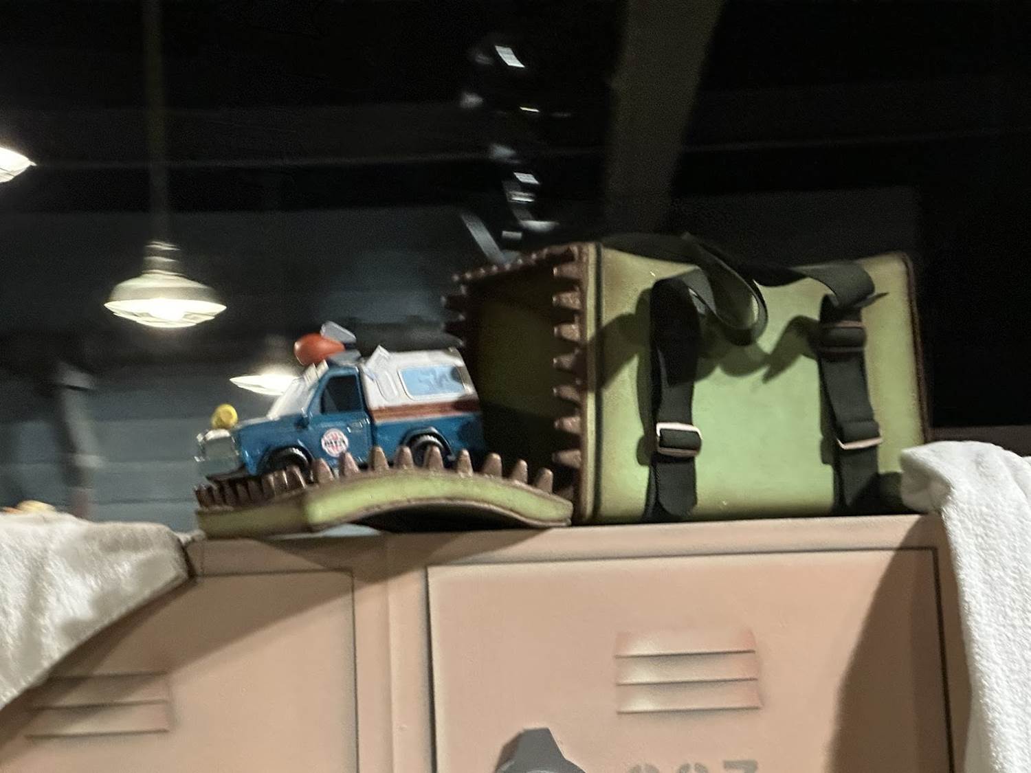 In the film Monster’s Inc., the Pizza Planet Truck is parked outside a trailer park where Randall was abandoned at the end. But on the ride, you’ll find it popping out of a gym bag in the locker room. No longer serving pizza, it’s now in service for the Monstropolis Transit Authority!