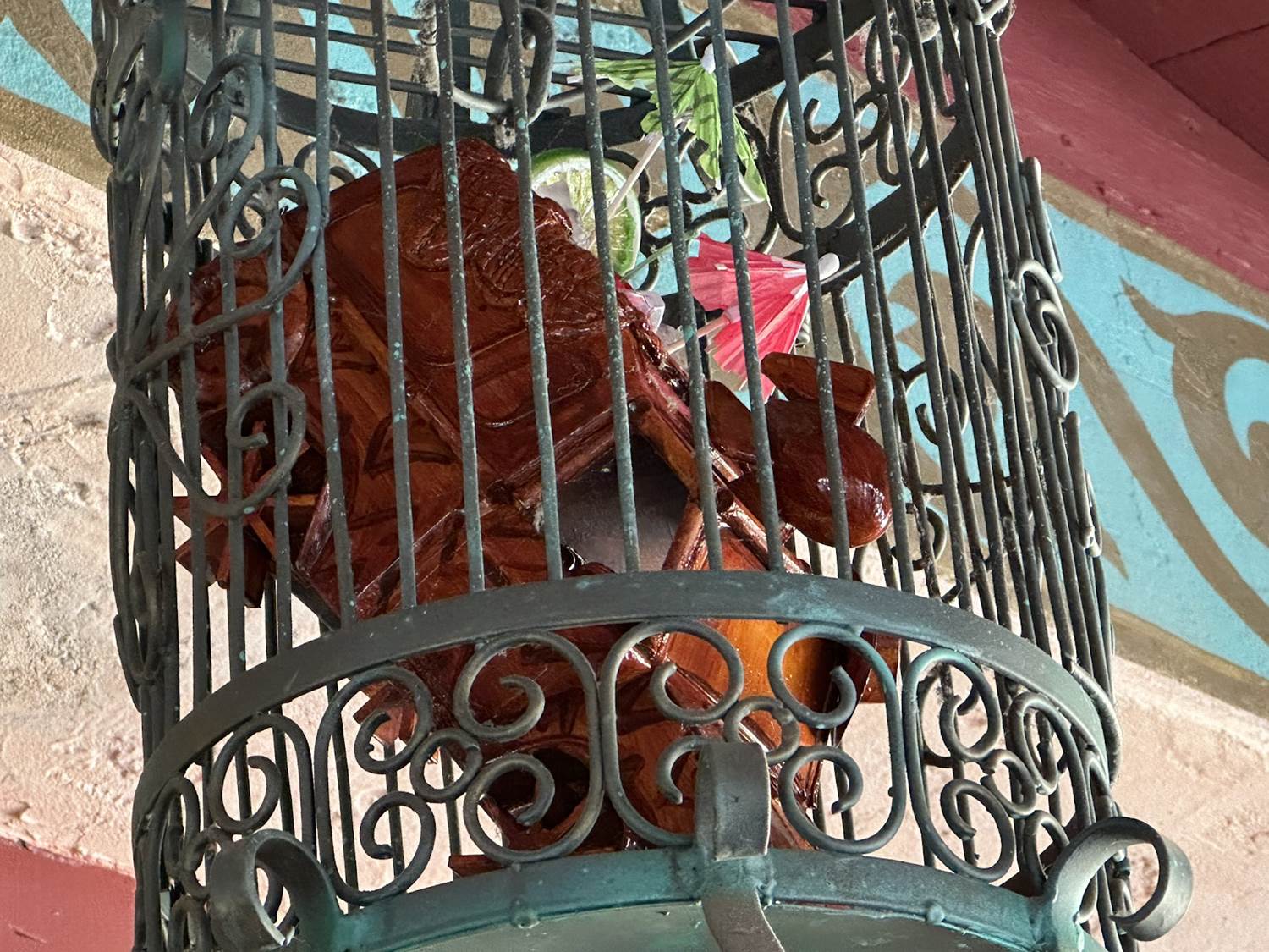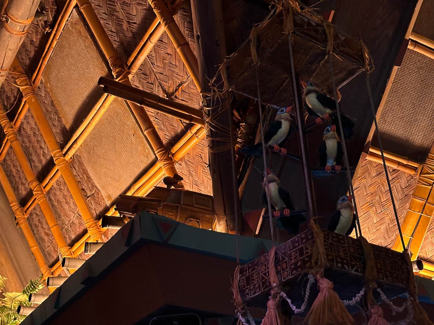 Treat yourself to something refreshing at the Tropical Hideaway, like the Lava-themed Pineapple Coconut Float, one of the limited time menu items for Pixar Fest. Too bad it doesn’t come in a souvenir tiki mug like this Pizza Planet Truck one, spotted in a birdcage at the Adventureland refreshment stand.