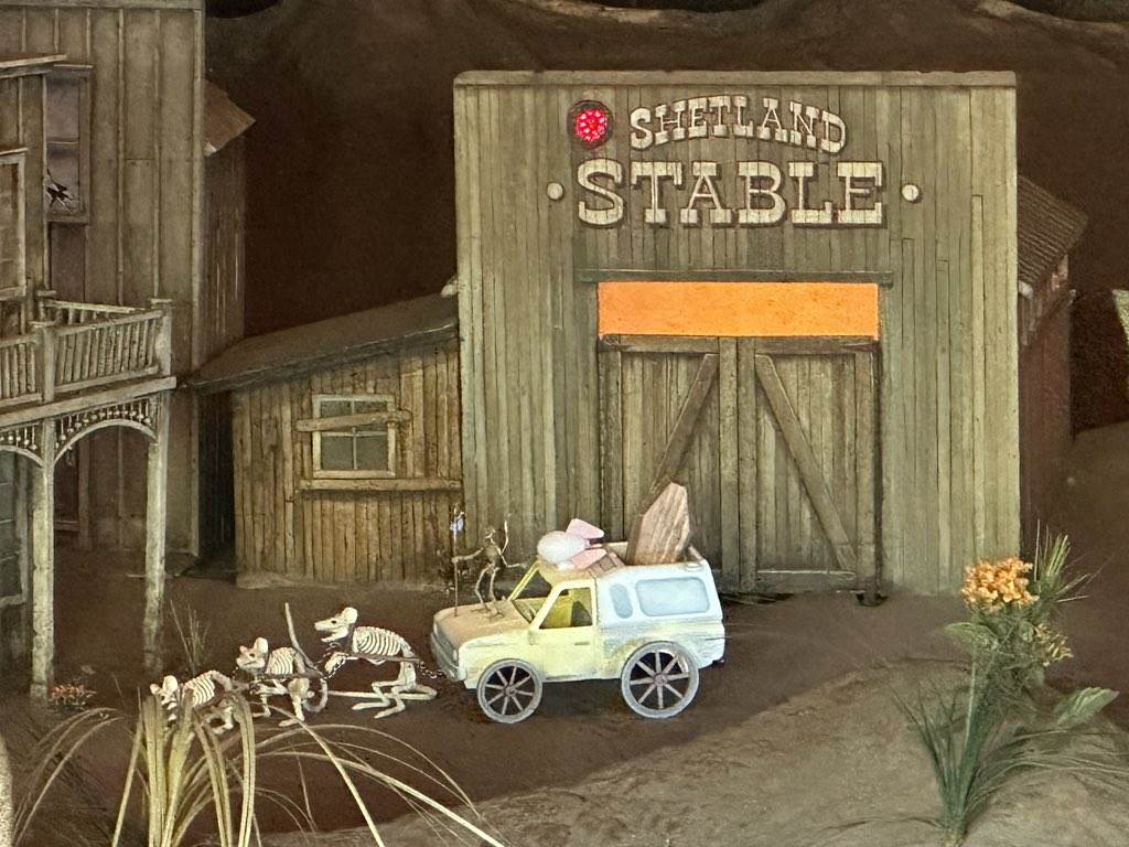 It’s a literal ghost town! The Pizza Planet Truck has become a covered wagon hearse, driven by three skeletal mice.