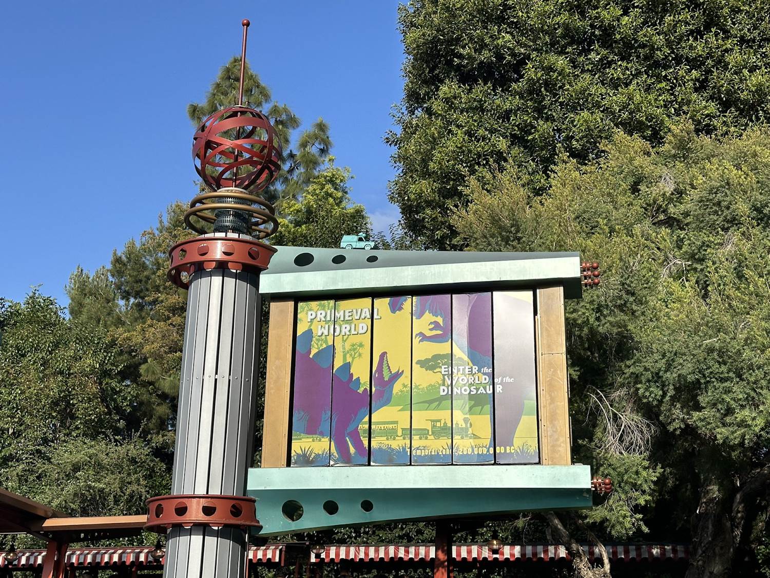 As you approach the Tomorrowland Train Station, a rotating sign advertises some of the sights you’ll see on your grand circle tour. Hey, what’s that parked above it?