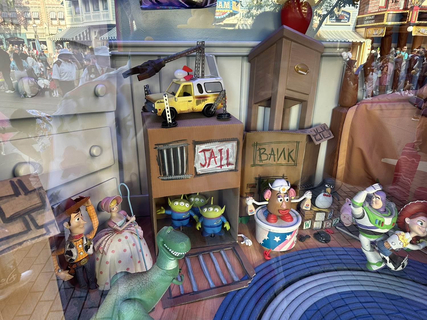 Walk to the end of the Emporium and look in the windows above the toy shop to see this wind-up Pizza Planet Truck. It’s next to the Meteor Cycle Co. sign and close to Disney Legend Bob Gurr’s window.