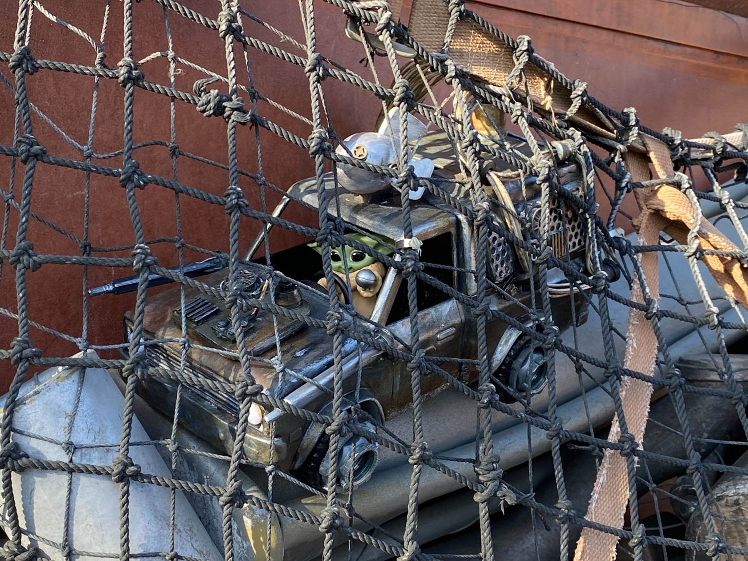 We’ve only found one Pizza Planet Truck hidden outside the parks, but it’s a really fun one. Explore the netting around Rey’s Speeder and see if you can find Grogu piloting his own Pizza Planet Truck. By the way, the Grogu figure inside is from Hasbro’s Star Wars Bounty Collection.