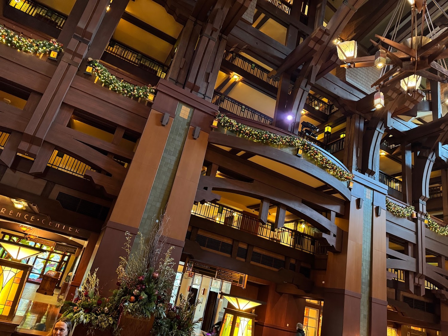 The majestic lobby of Disney’s Grand Californian Hotel & Spa is all decked out for the holidays, complete with an impressively large Christmas tree, gingerbread house and special treats.