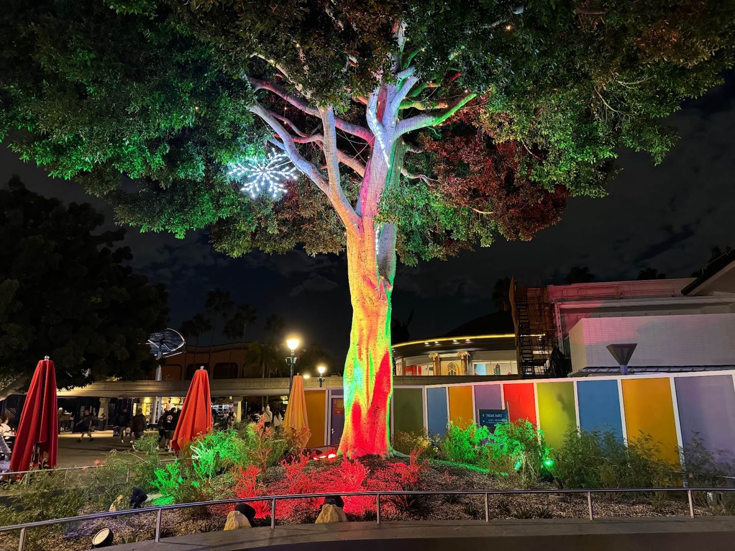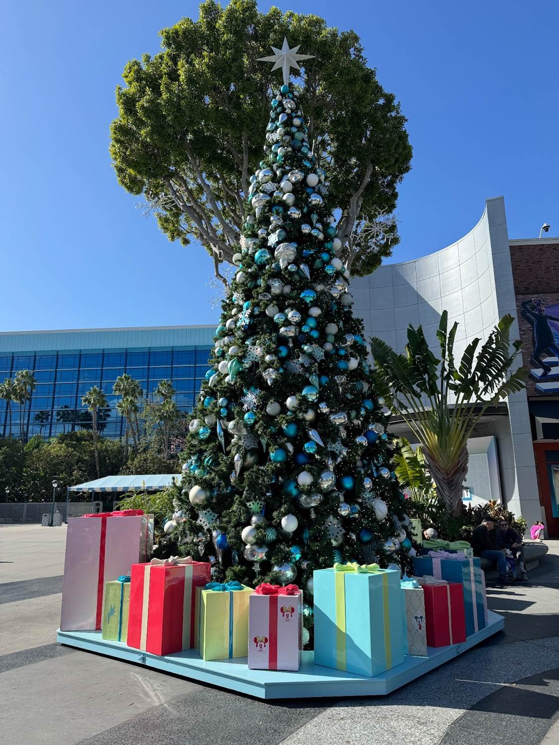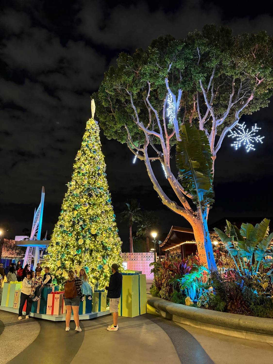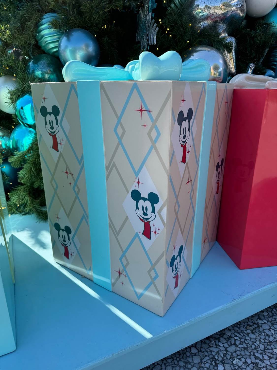 The Christmas tree, located near the former ESPN Zone, has received a new base this year. Disney characters are featured alongside mid-century style designs that evoke the new expansion to Downtown Disney.