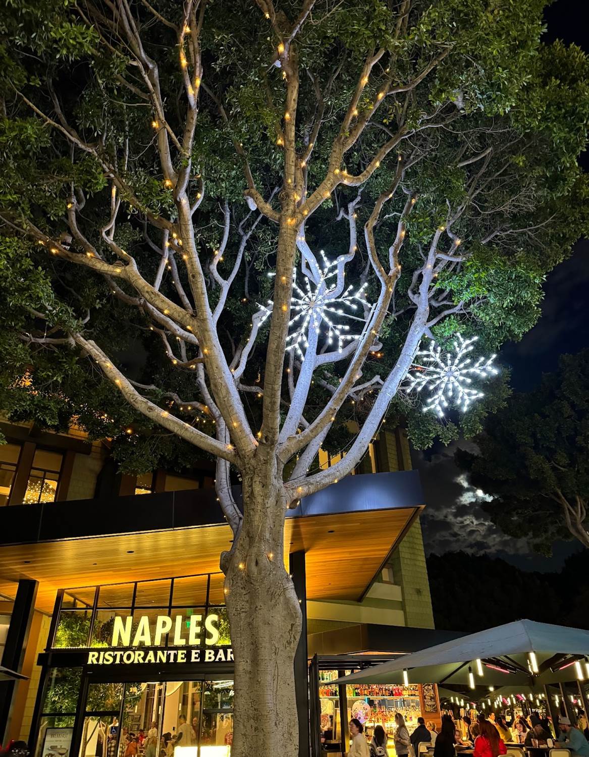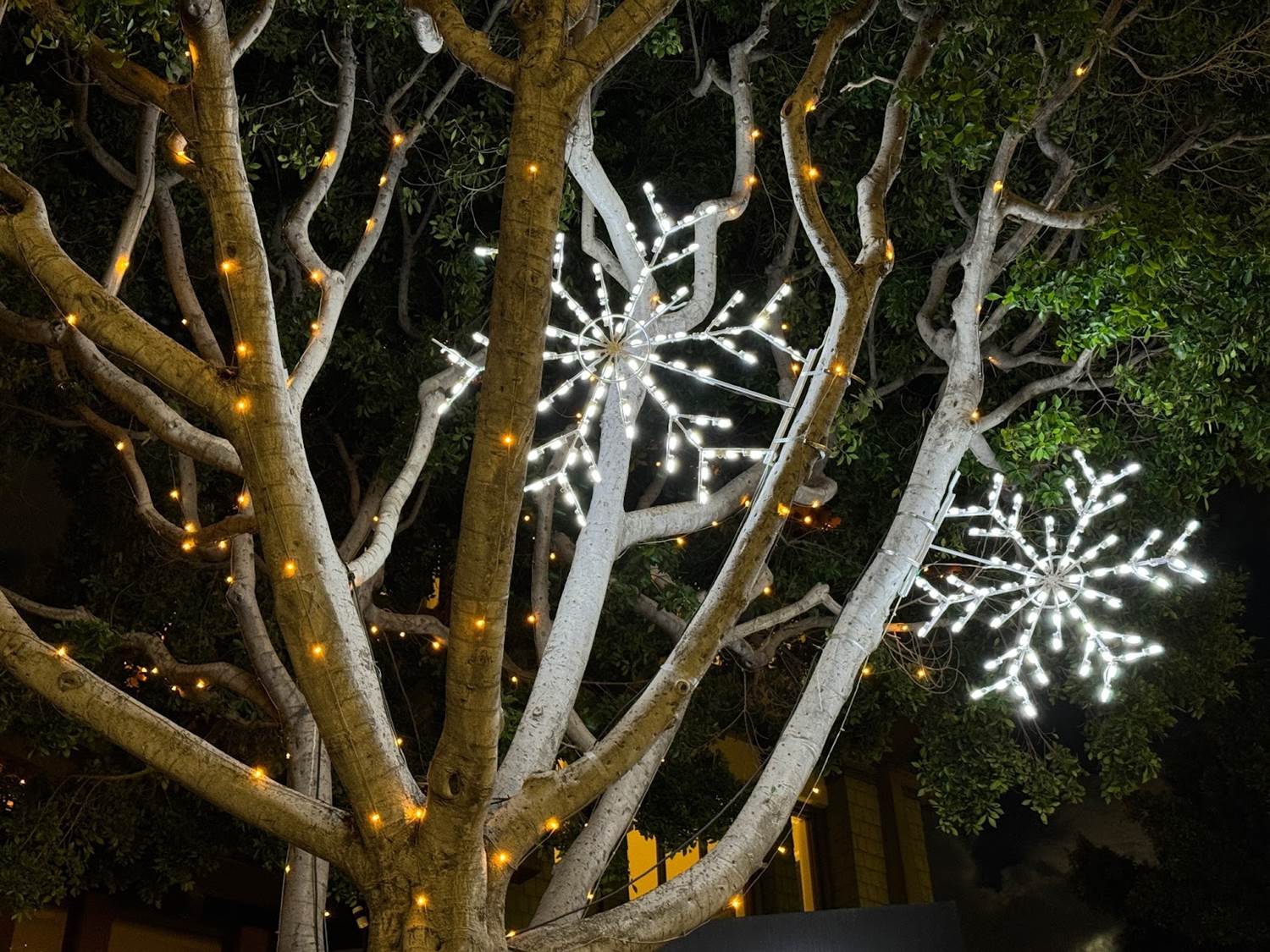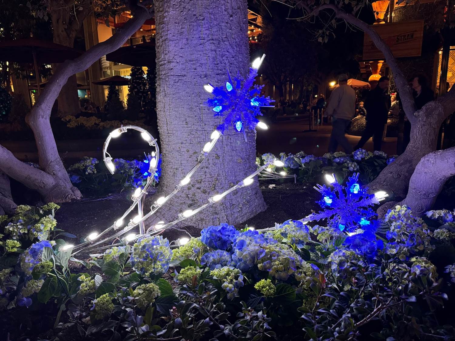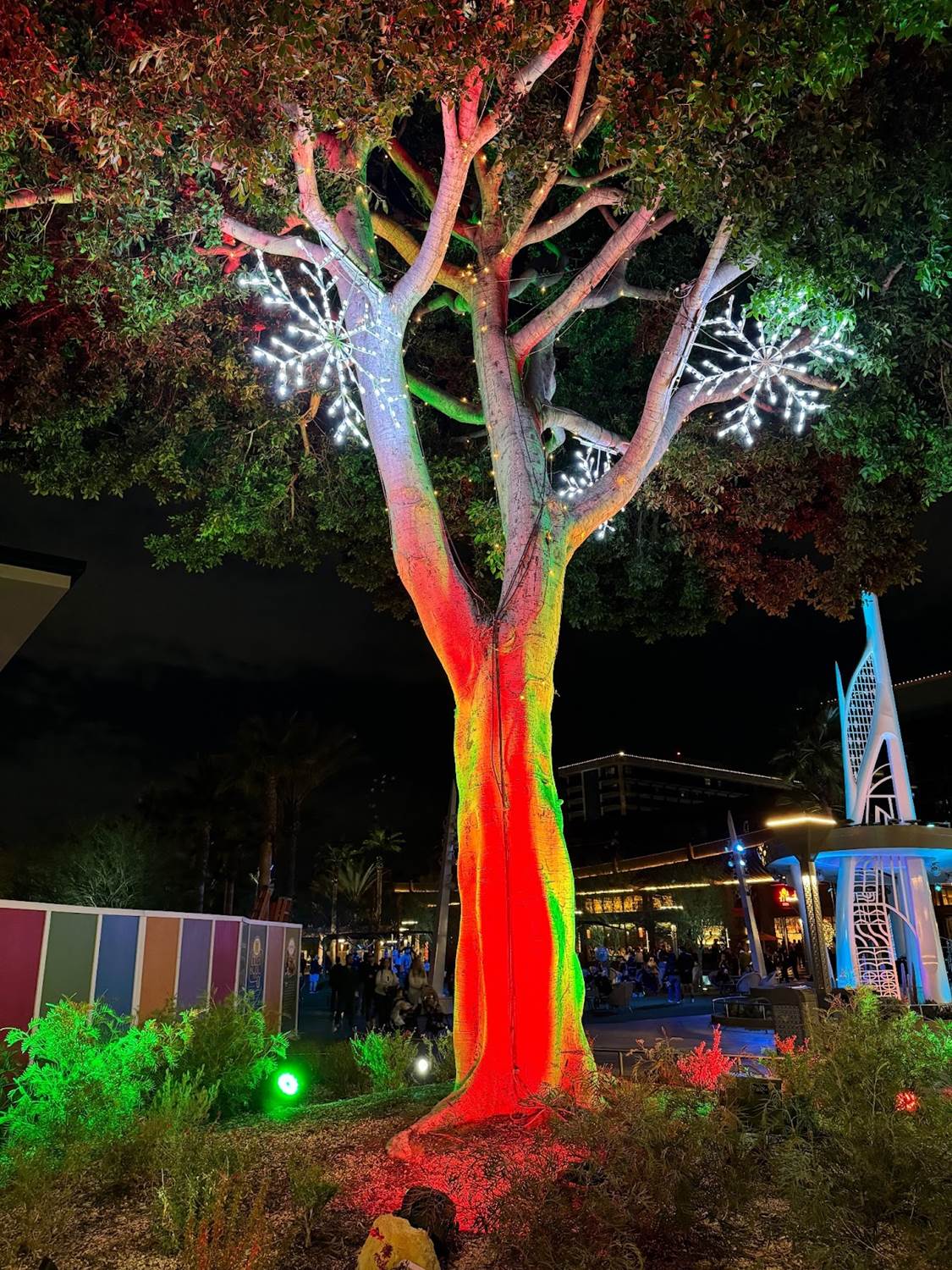 The Christmas tree, located near the former ESPN Zone, has received a new base this year. Disney characters are featured alongside mid-century style designs that evoke the new expansion to Downtown Disney.