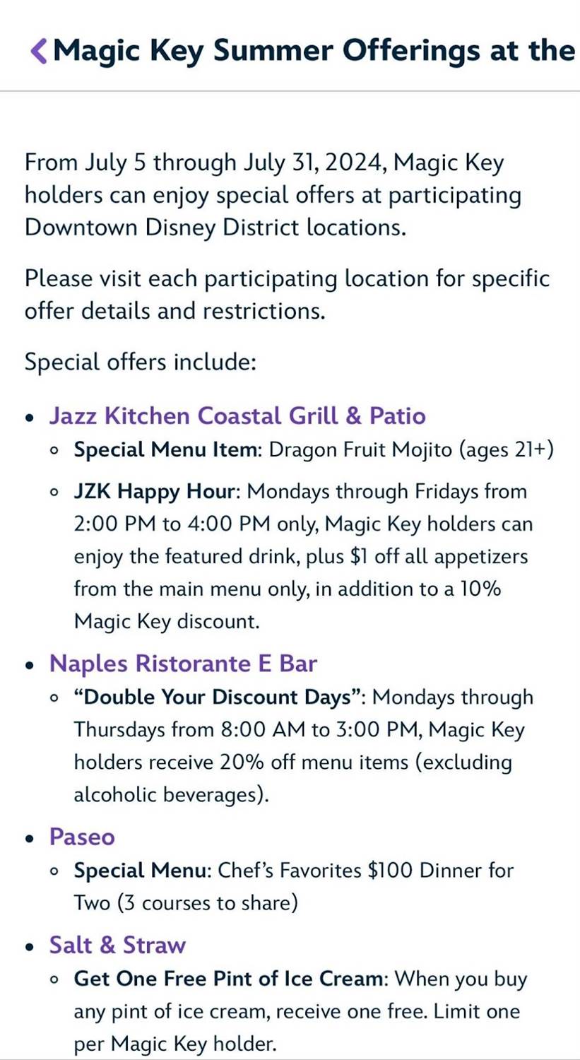 - Disneyland Resort: “From July 5 through July 31, 2024, Magic Key holders can enjoy special offers at participating Downtown Disney District locations. Please visit each participating location for specific offer details and restrictions."