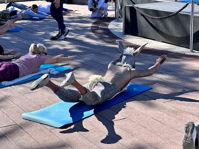 The class took place in Waterview Park, located at The Landing between The Boathouse and Jock Lindsey’s Hangar Bar. Led by Drawn to Life artists and coaches, the special session had attendees participating in stretches, yoga poses and body weight exercises.
