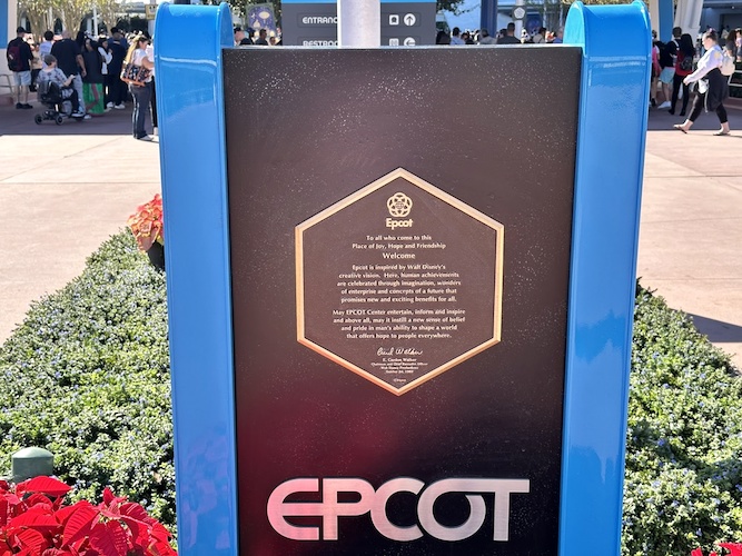 EPCOT’s dedication plaque has been missing from the park’s entrance for a few months but has now returned with a new look.