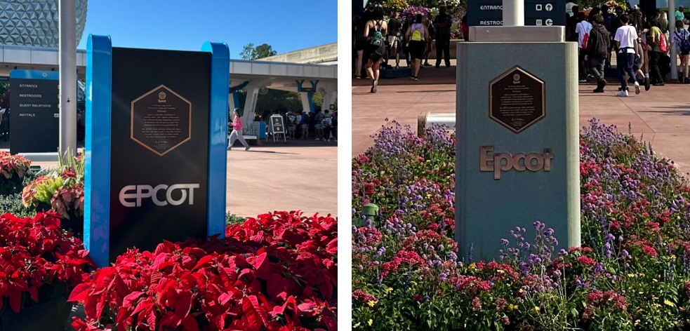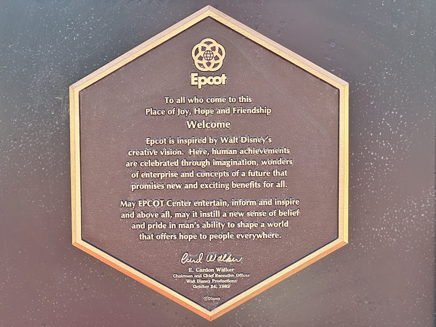 EPCOT’s dedication plaque has been missing from the park’s entrance for a few months but has now returned with a new look.