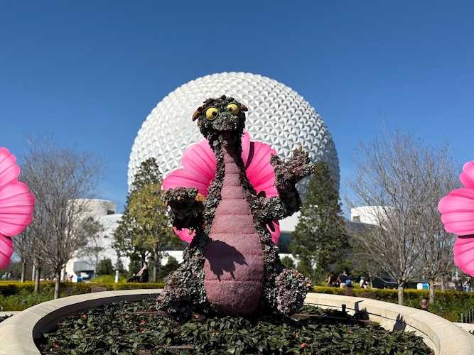 We’ll begin in the center of the park, where Figment and some colorful flowers have taken their place in the EPCOT logo-shaped planter.