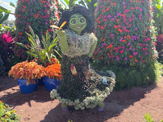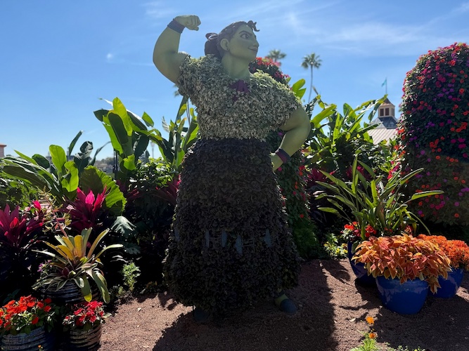 Over at the entrance to World Showcase, the large Encanto topiary collection has been installed – featuring Mirabel, Isabella, Luisa and Antonio.